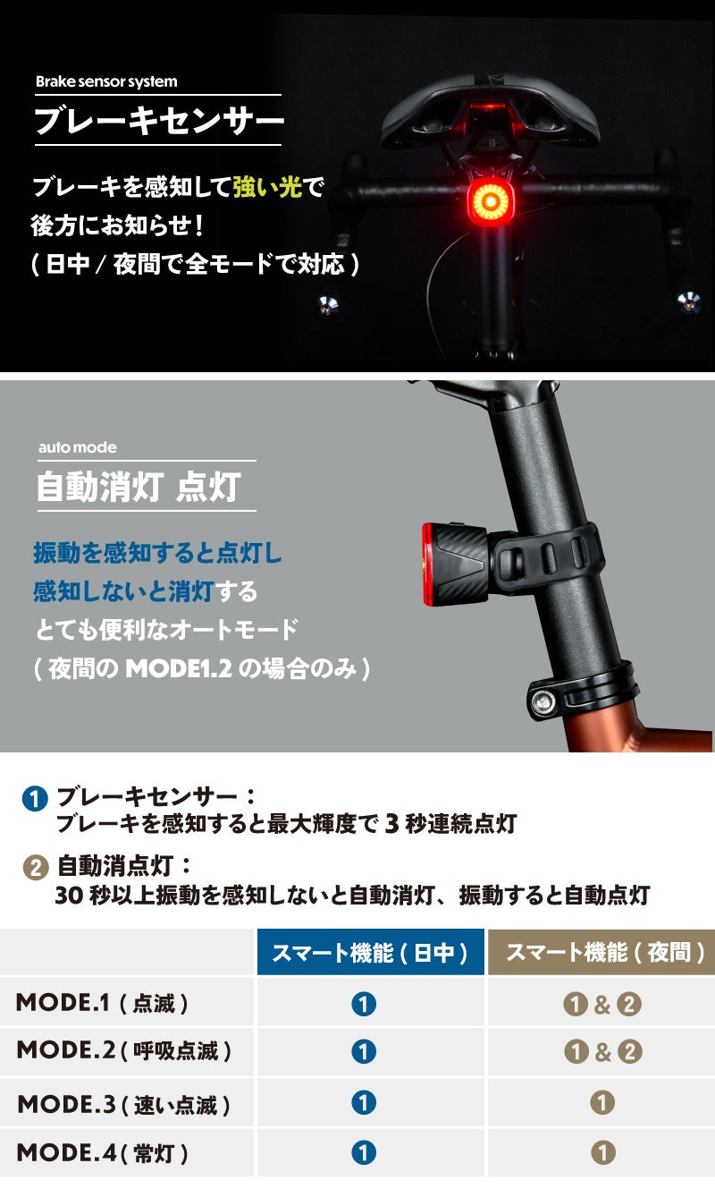 ブレーキや振動を感じたら高輝度で後方にお知らせするリアライトです。