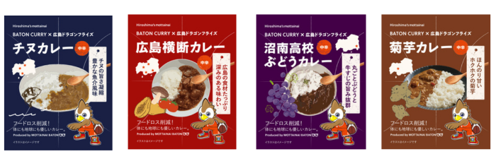 この度発売するレトルトカレーは、広島のもったいない食材(フードロス食材)4種を使用したモッタイナイバトン社のオリジナル商品です。広島ドラゴンフライズの華麗(カレー)なる勝利とフードロス問題解決の願いを込め、マスコットキャラクター「モヒカンアビィ」のイラストとメインとなる食材のイメージカラーでパッケージをデザインいたしました。