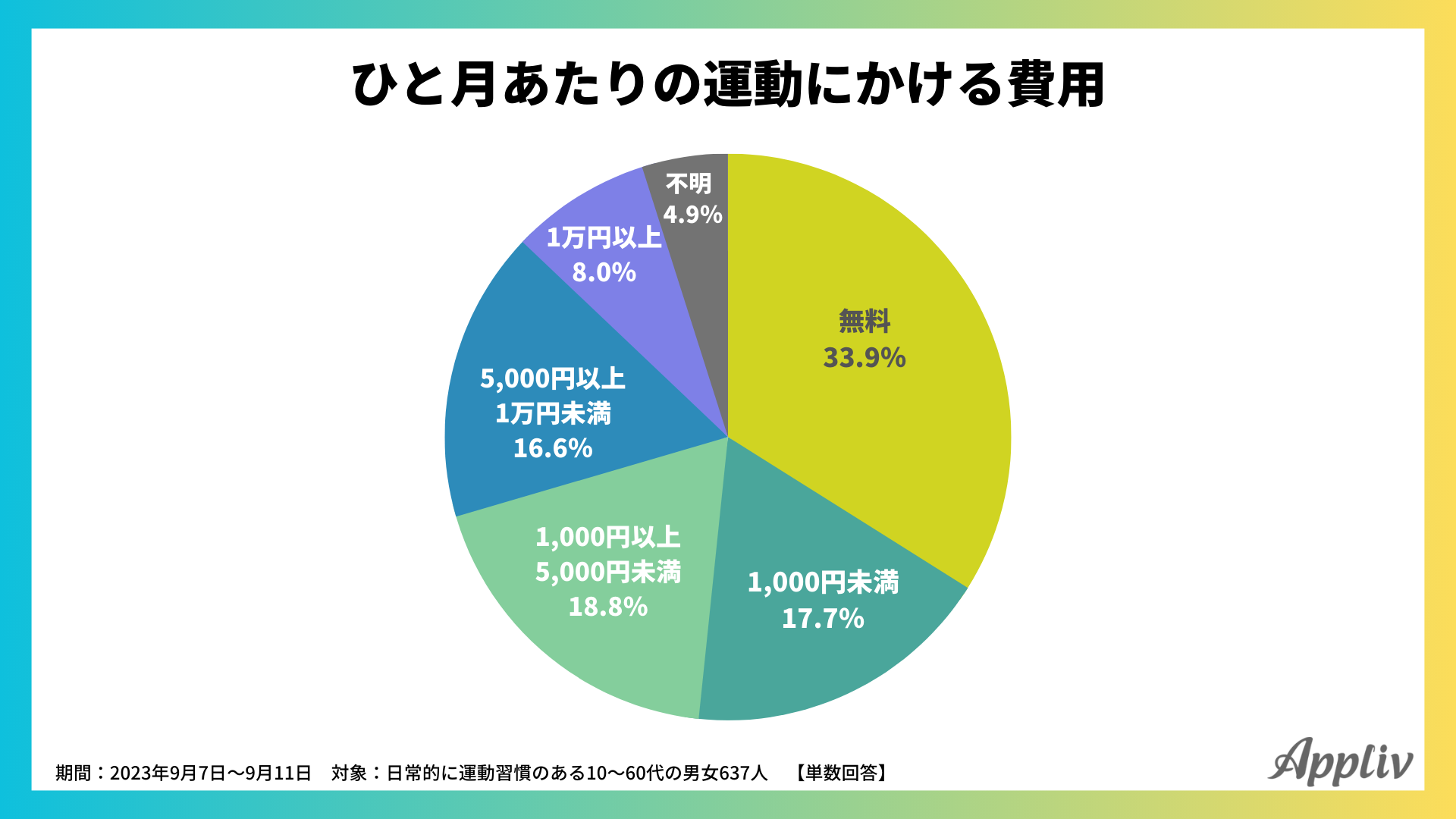 運動するためにひと月どのくらいのお金をかけているかを調べた結果、上位は「0円(33.9%)」、「1,000円以上5,000円未満(18.8%)」、「1,000円未満(17.7%)」でした。