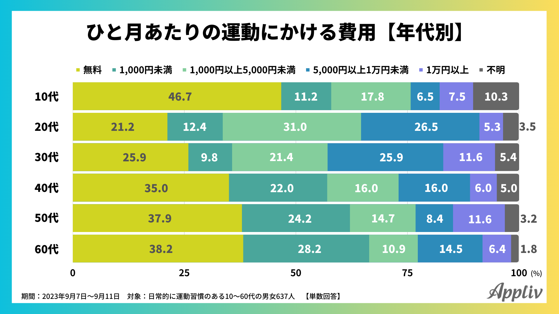 部活やサークルなどで日常的に運動できる環境が社会人と比べて多い10代や、徐々に体力が低下し、生活の一部として運動を取り入れはじめる40代以降と比較すると、20代30代の方がかけている費用が高いことは自然な傾向だと考えられます。