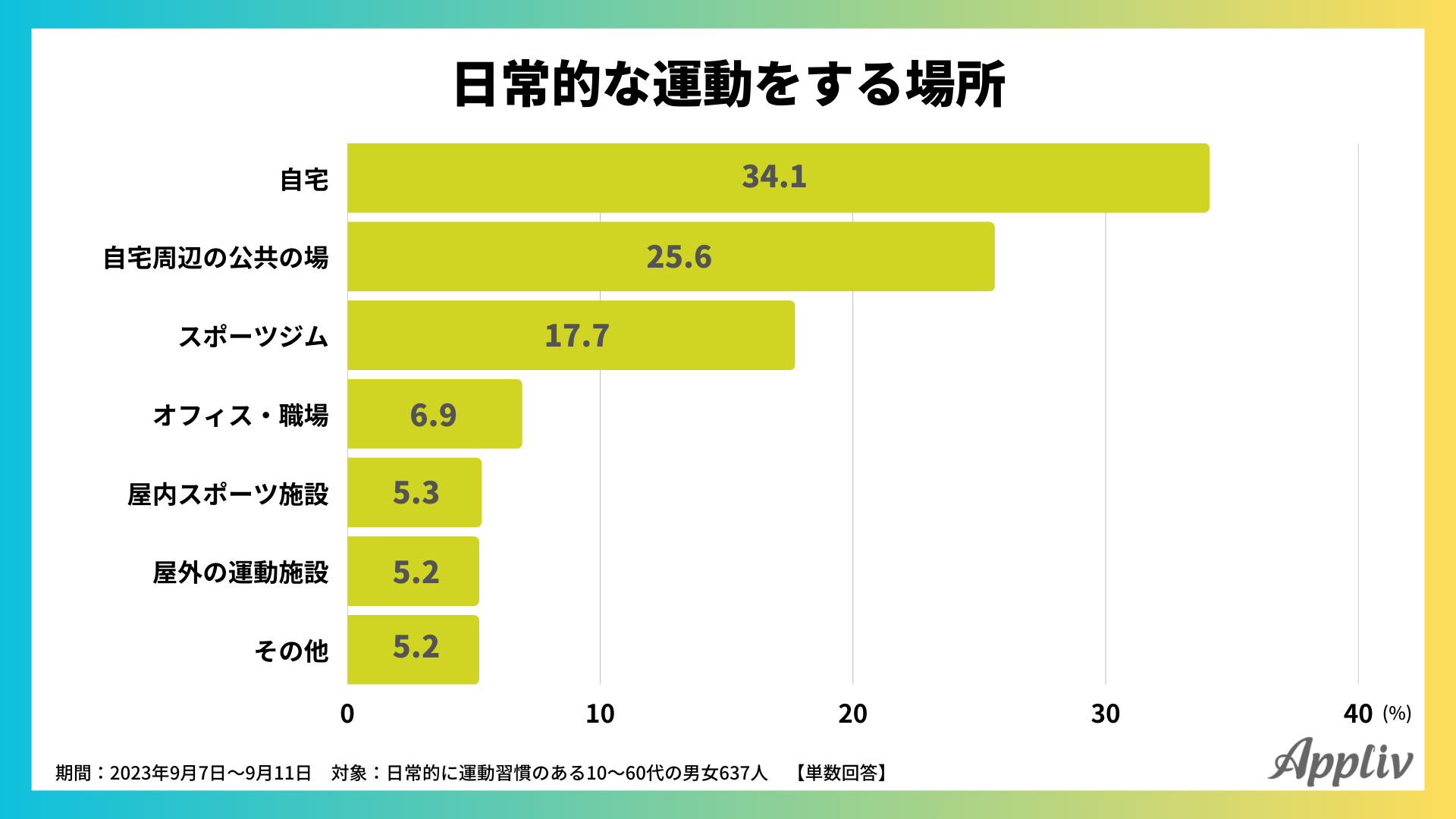 日常的な運動場所は「自宅(34.1%)」がトップ、「スポーツジム(17.7%)」は3位