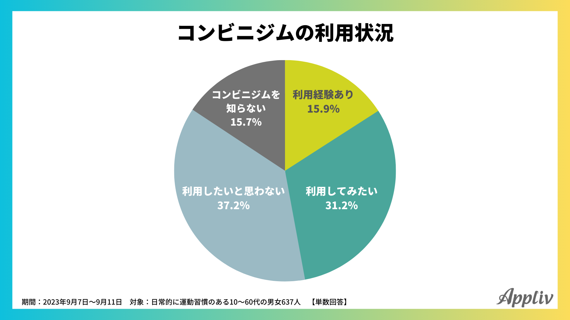最近店舗数が増えているコンビニジム(小規模かつ無人、24時間いつでも気軽に通えるジム)の利用経験を尋ねてみたところ、「利用経験あり」が15.9%、「利用してみたい」が31.2%でした。