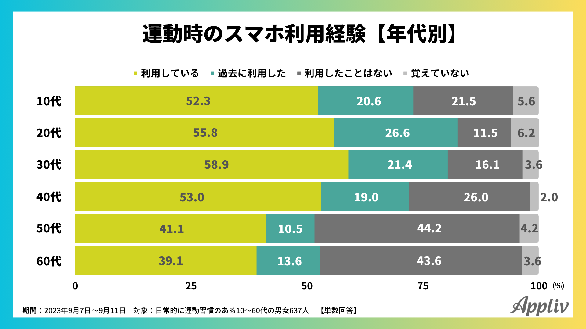 年代別に見ると、10〜40代は全ての年代で7割以上の人が運動中のスマホ利用経験があるのに対し、50〜60代は「一度も利用したことがない」と回答した人が4割以上です。