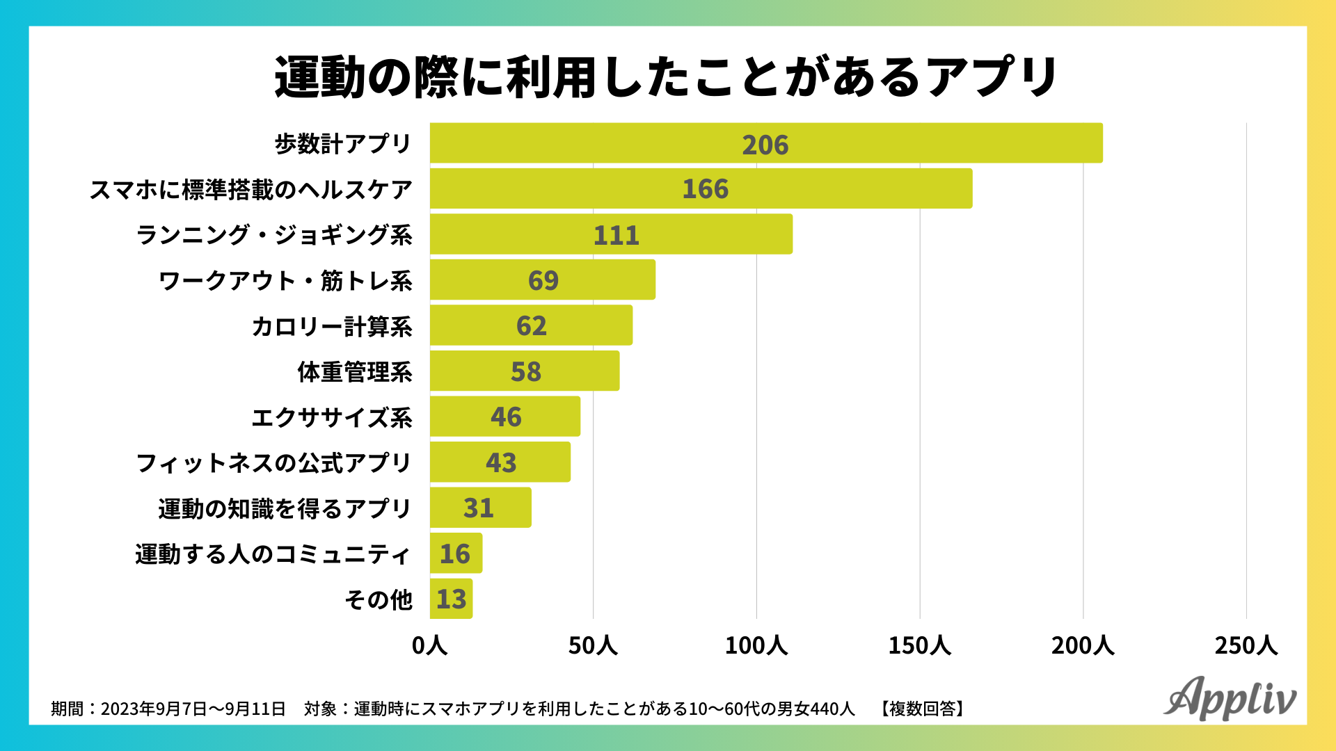 運動時に利用するアプリTOP3は、1位「歩数計アプリ(206人)」、2位「スマホに標準搭載のヘルスケアアプリ(166人)」、3位「ランニング・ジョギングトラッキングアプリ(111人)」でした。