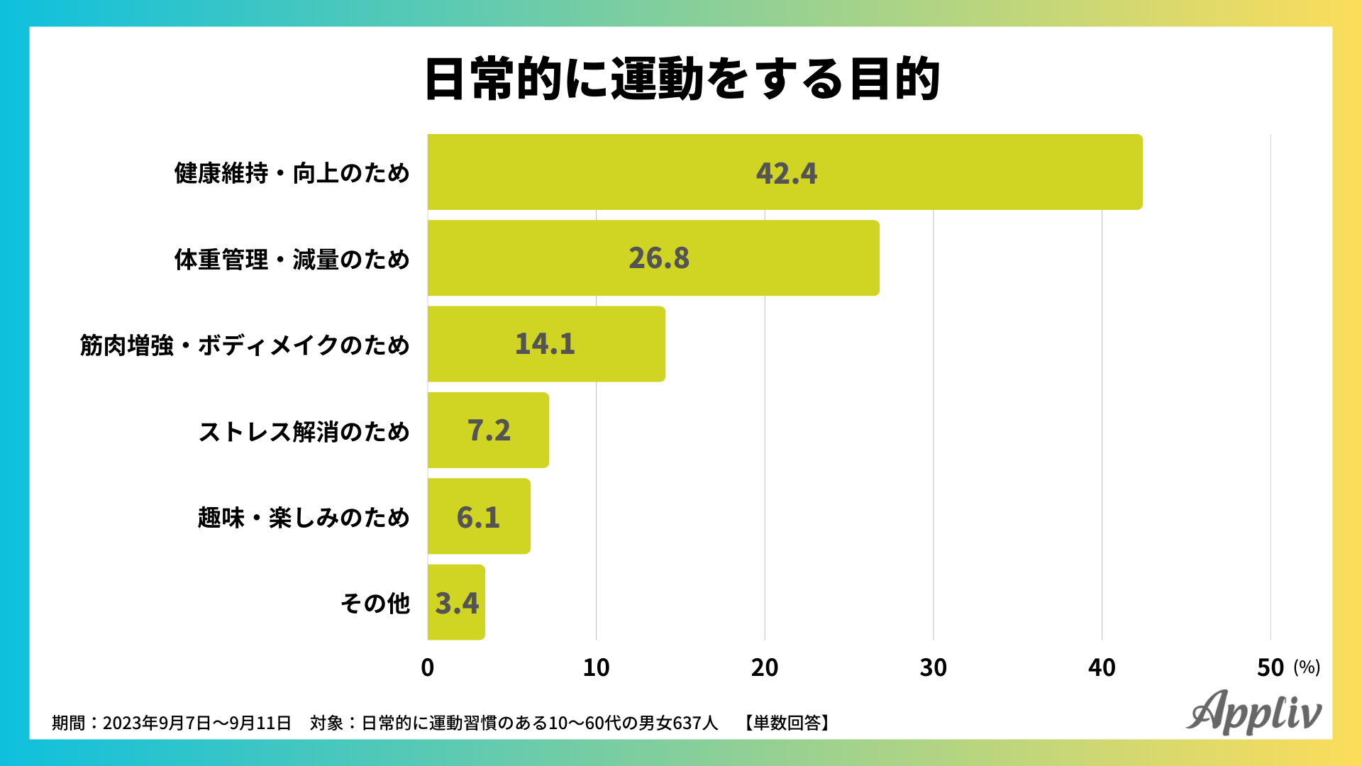 日常的に運動をしている10~60代の男女637人を対象に、運動の目的を聞いてみたところ、1位は「健康の維持・向上のため(42.4%)」でした。