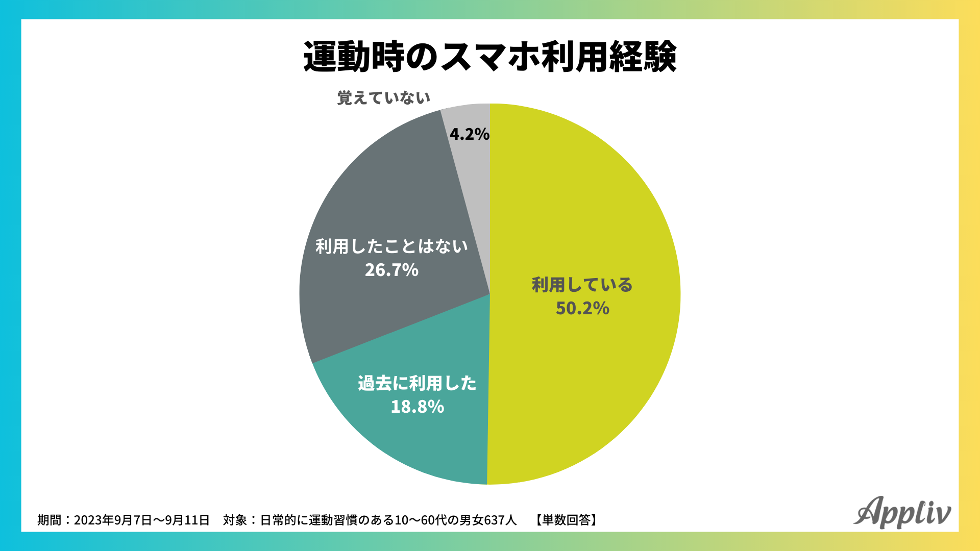 運動する際のスマホの利用経験を尋ねると、50.2%が「利用している」と回答。運動中にスマホを利用したことがない人は全体の26.7%でした。