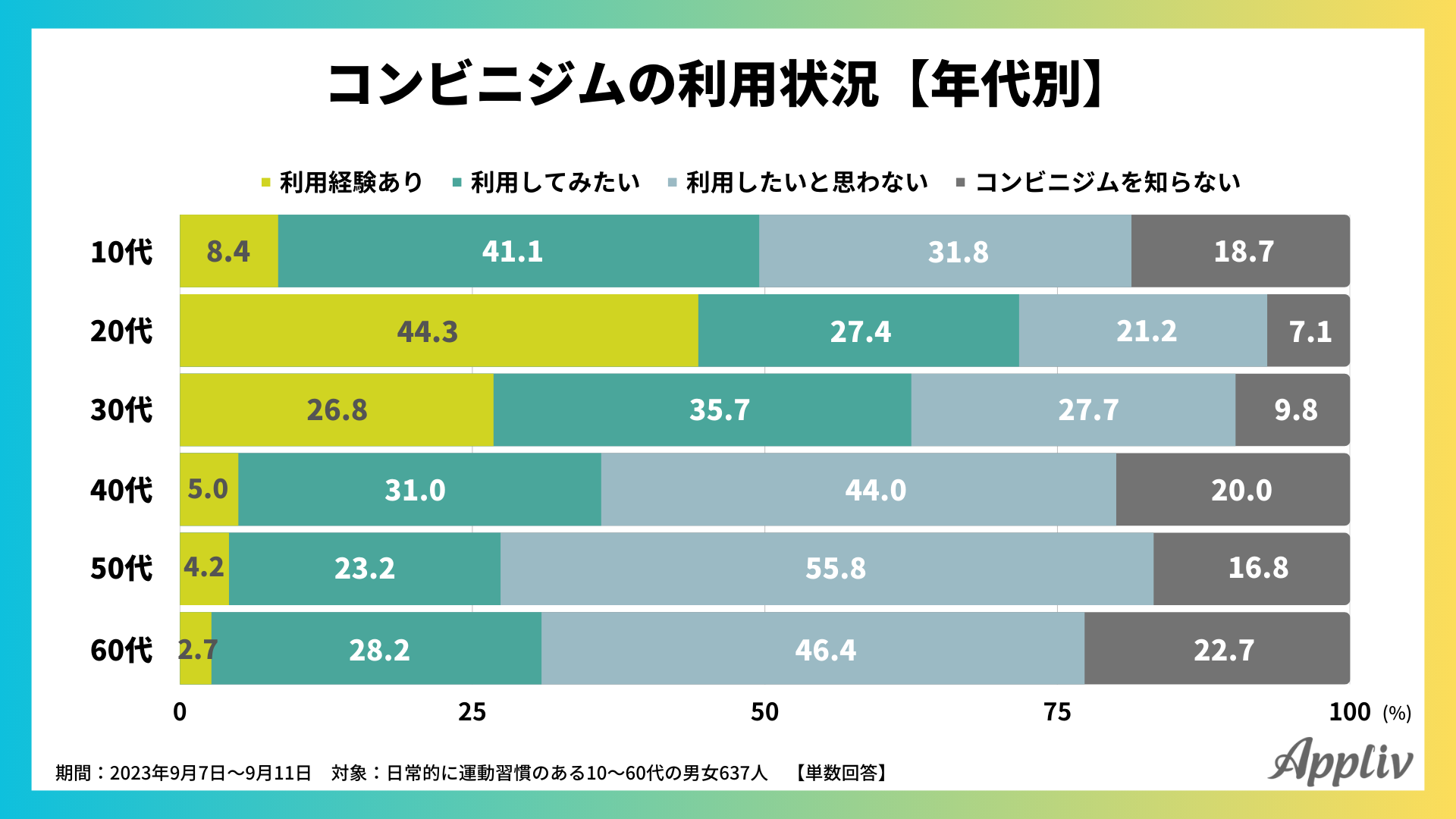 他の世代と比較して意欲が高いことから、時間の制約が少なく、手軽に利用できるコンビニジムの利用者は20代30代を中心に、これから伸びていくのではないでしょうか。