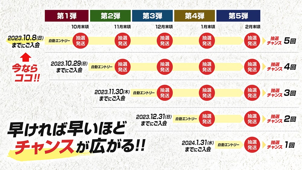 キャンペーン期間内に入会、または継続の手続き完了で抽選の対象となり、第一弾(10月8日まで)で入会すると全5回の抽選に自動エントリー、早い時期はエントリー人数が少ないこともあり、当選確率が格段にアップします!