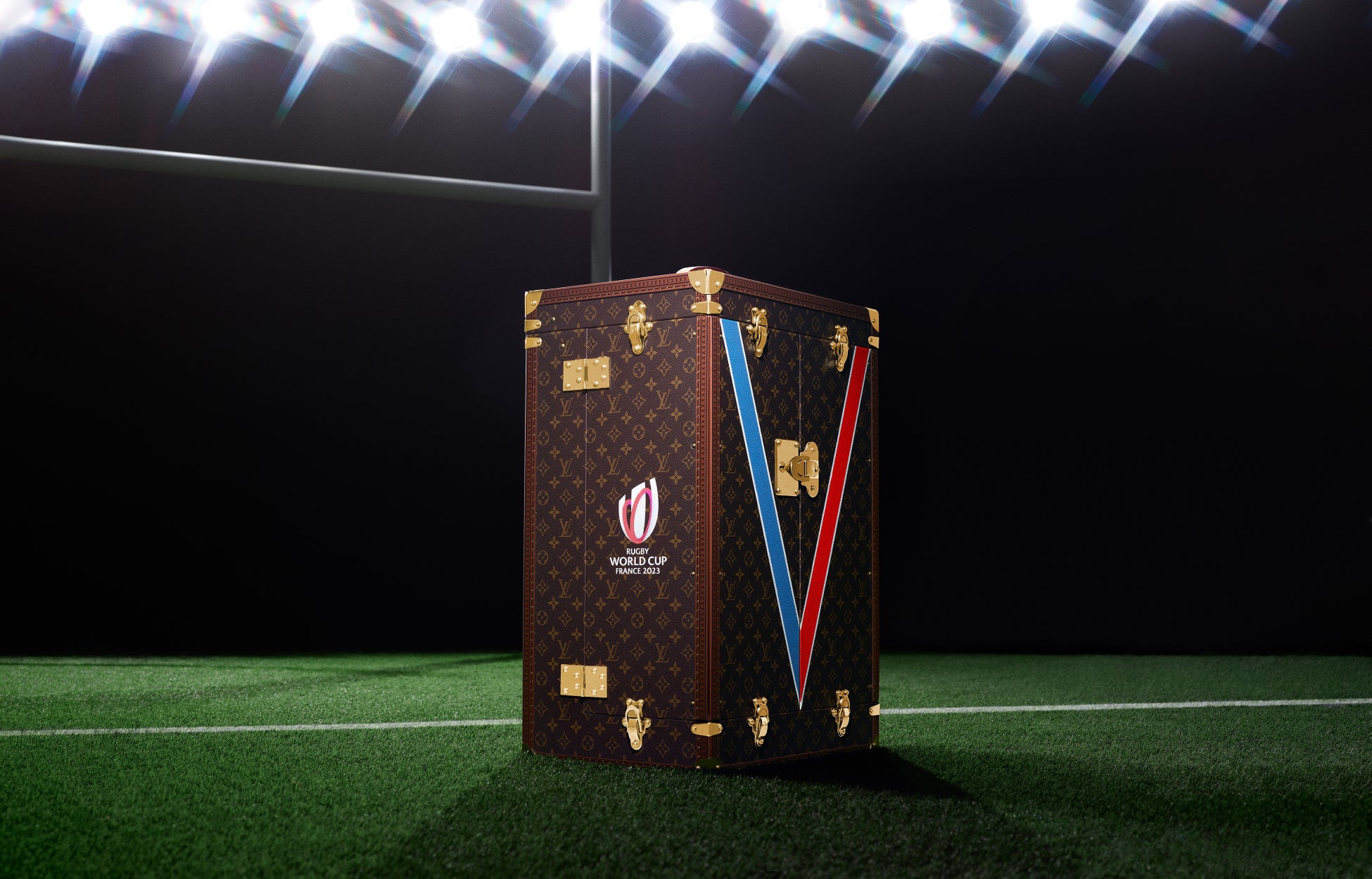 パリ郊外に佇むメゾンの歴史的なアニエールのアトリエで、熟練したルイ・ヴィトンの職人たちの手作業によって生み出され、特別にデザインされたトランクは、外装に伝説的なルイ・ヴィトンのモノグラム・キャンバスを使用。トランクの2枚のフロントパネルには、大会のロゴとフランス国旗を想わせるブルー、ホワイト、レッドで、「Victory(勝利)」、そして「Vuitton」を表す「V」がペイントで施されています。また側面には、「ラグビー・ユニオン」の1チームのプレイヤー数として、ラグビーの世界で特別な意味を持つ数字である15がローマ数字「XV」で描かれ、もう片側には「ラグビーワールドカップ2023フランス大会」のロゴがあしらわれています。さらにレザーのトリミングで仕上げられ、1860年代からルイ・ヴィトンのトランクに使用されてきた真鍮製のコーナープロテクター、ロック、留め具を採用。そしてメゾンのトロフィー・トランク コレクションとしては初めて、「V」の装飾と同じ鮮やかなパントンブルーのラグジュアリーなルイ・ヴィトン レザーをライニングに使用。さらに、蓋の内側にあしらわれた「Rugby World Cup 2023」のロゴパッチが、ケースの特別感をより一層高めます。