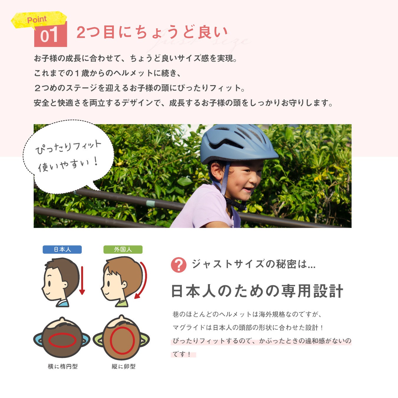 日本人の頭部の形状に合わせた専用設計で頭にフィットし、そしてお子さまの着用ストレスをなくすために超軽量の「MagRideセカンド220」 を開発致しました。