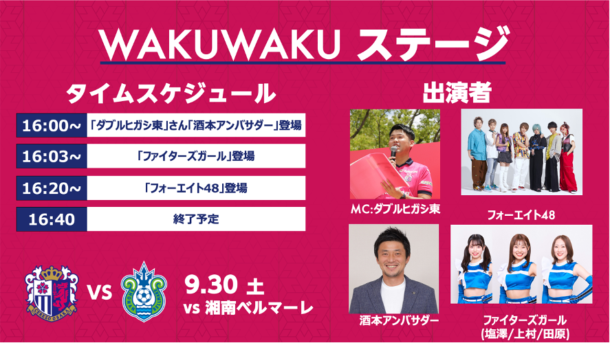 セレッソ大阪では土日祝の試合を中心に、スタジアム場外でもWAKUWAKUを感じていただけるように「WAKUWAKUステージ」を開催いたします。