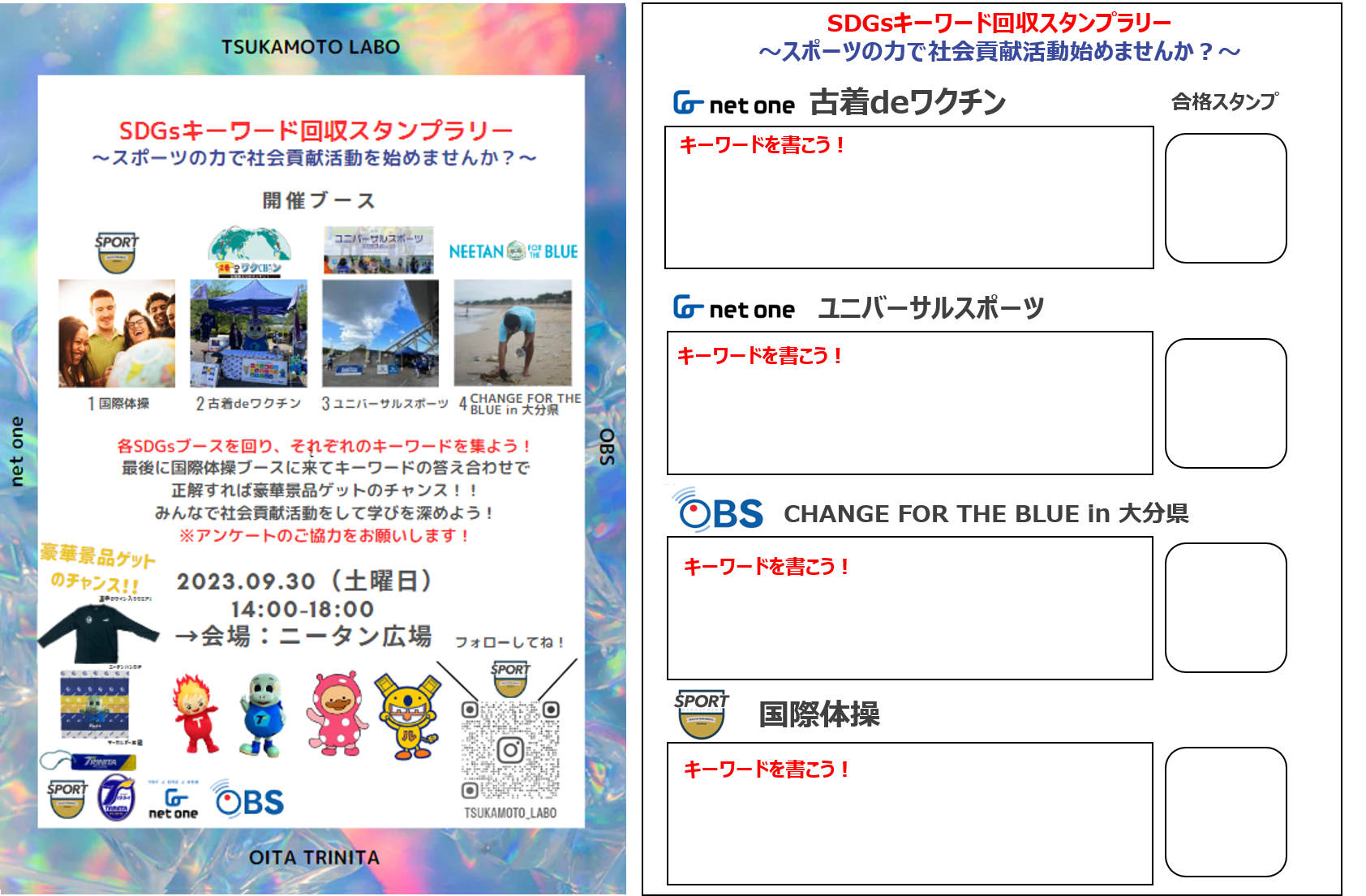 大分トリニータは産学連携によるスポーツを通じた新しい社会貢献活動を、帝京大学塚本研究室(国際体操)、ネットワンシステムズ株式会社(古着deワクチンとユニバーサルスポーツ)、OBS大分放送(CHANGE FOR THE BLUE in 大分県)、株式会社大分フットボールクラブが主体となり行います。また上記の社会貢献活動について、帝京大学塚本研究室と筑波大学松尾研究室の協力を得て、①広告換算(報道分析)②SNS分析(間接受益者の反応)③主体への定性調査 ④ブース参加者への定量調査、などを通して、社会効果の調査分析を行います。