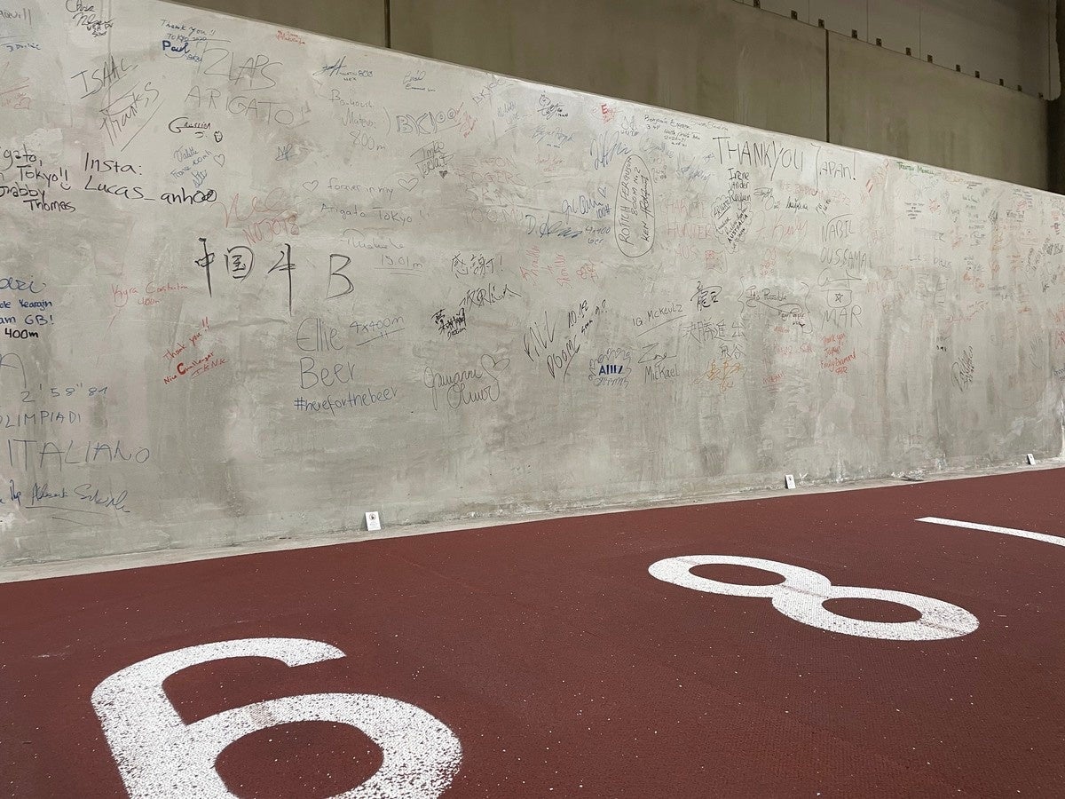 国立競技場の地下にあるサインウォールには、ここで熱い戦いを繰り広げた選手たちの直筆サインが。憧れの選手のサインも残されているかも?