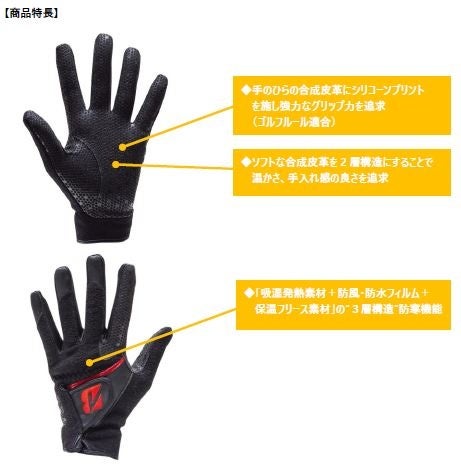 同商品は、『ULTRA GRIP』でご好評をいただいている、手のひら側全面にシリコーンプリント加工を施した強力なグリップ力はそのままに、甲側には「吸湿発熱素材+防風・防水フィルム+保温フリース素材」の3層構造の防寒機能生地を採用しています。また手のひら側にはソフトな合成皮革を2層構造にすることで、温かさと手入れ感の良さを追求しています。寒さ対策としての温かさに加え、グリップ力や手入れ感にもこだわることで、できる限り普段と変わらない着用感でプレーしたいというゴルファーの要望に応えた冬用グローブです。