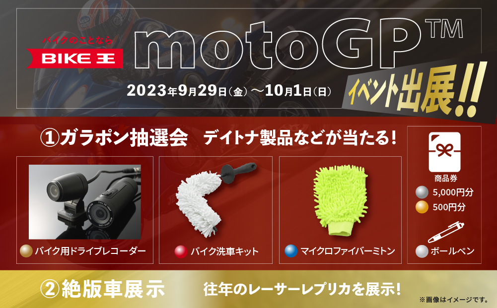MotoGP(ロードレース世界選手権)は、FIM(国際モーターサイクリズム連盟)が主催する二輪レースの最高峰カテゴリー。世界各地でバトルが行われ、日本グランプリは昨年に引き続きモビリティリゾートもてぎで開催されます。当社では、デイトナ製品が当たるガラポン抽選会や絶版車を展示します。この機会に是非ご参加ください。