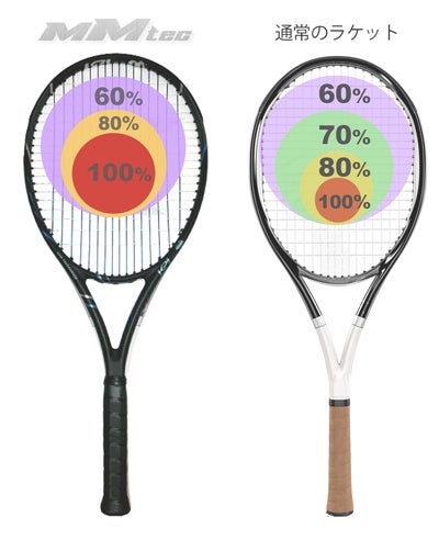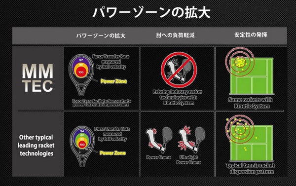 MMTechnologyのシステムを4方向に配置し、ラケットフレームをクロス方向で支えることにより、スイートエリアの15%拡大、衝撃軽減率20%、振動減衰性43%、面安定性が50%向上。