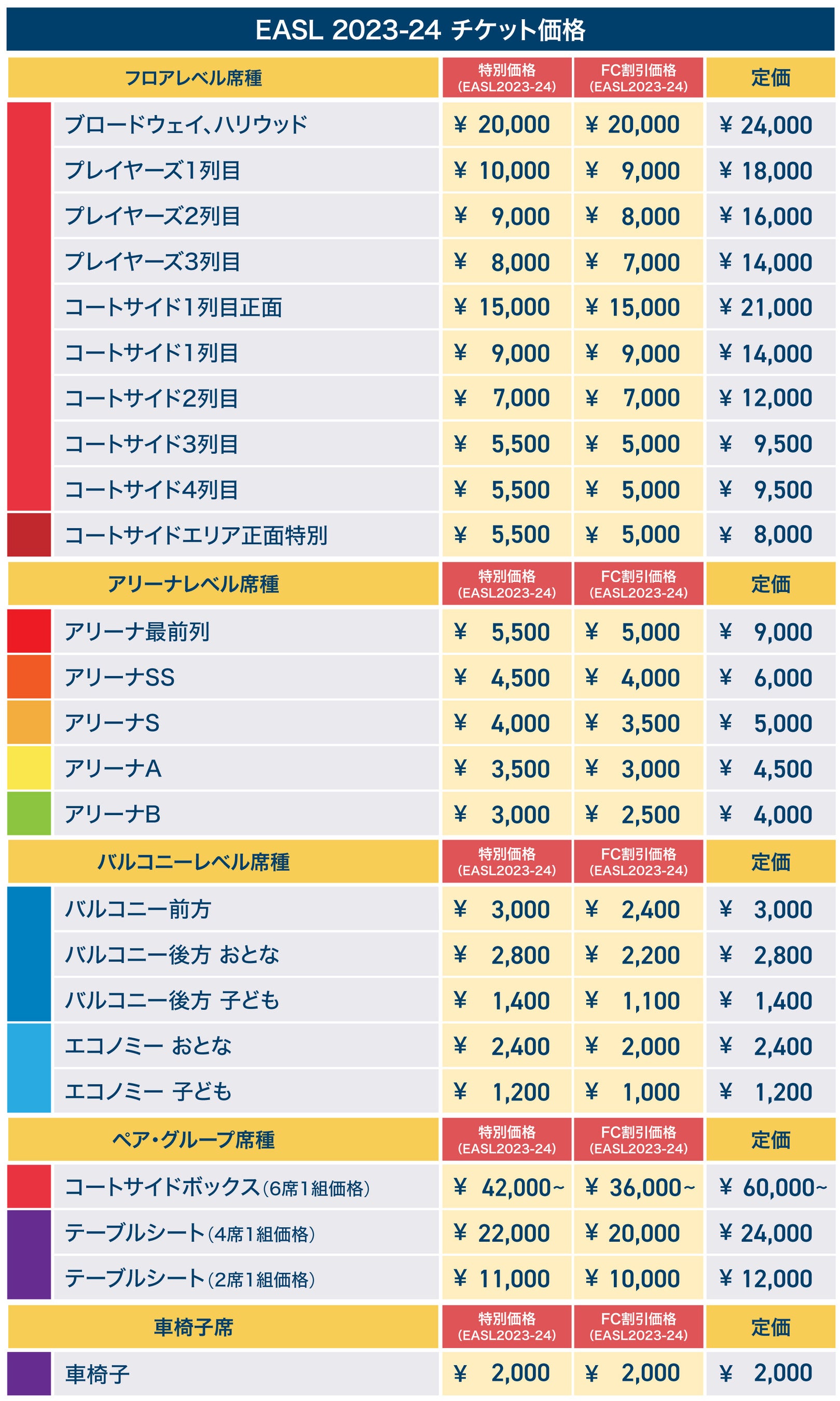 先日、東アジアスーパーリーグ(East Asia Super League以下:EASL)より発表された、EASL 2023-24シーズンのグループステージ対戦カードのチケット販売概要をお知らせします。本大会は、「EASL 2023-24シーズン特別価格」にてチケット販売を行いますので、ぜひ多くのご来場をお待ちしております。