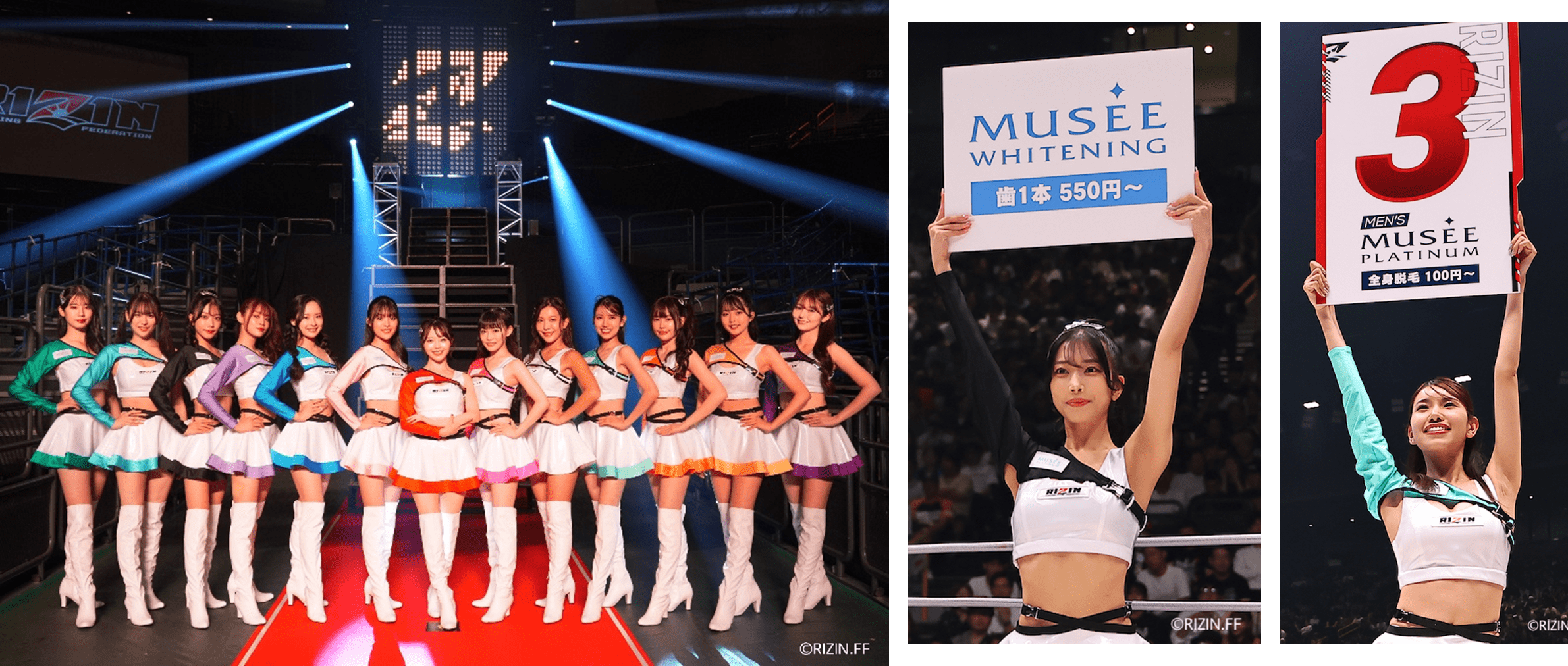 ミュゼプラチナムは、そんな「RIZIN」のリングを彩り盛り上げる「RIZINガール2023」のメインスポンサーに決定。9月24日にさいたまスーパーアリーナで開催された「RIZIN.44」にて、ミュゼプラチナムロゴが胸元に入った新しいユニフォームを身に纏った「RIZINガール2023」の皆さまが、ミュゼホワイトニングロゴとメンズミュゼプラチナムロゴの入ったボードを掲げるなど、華々しいデビューを飾りました。