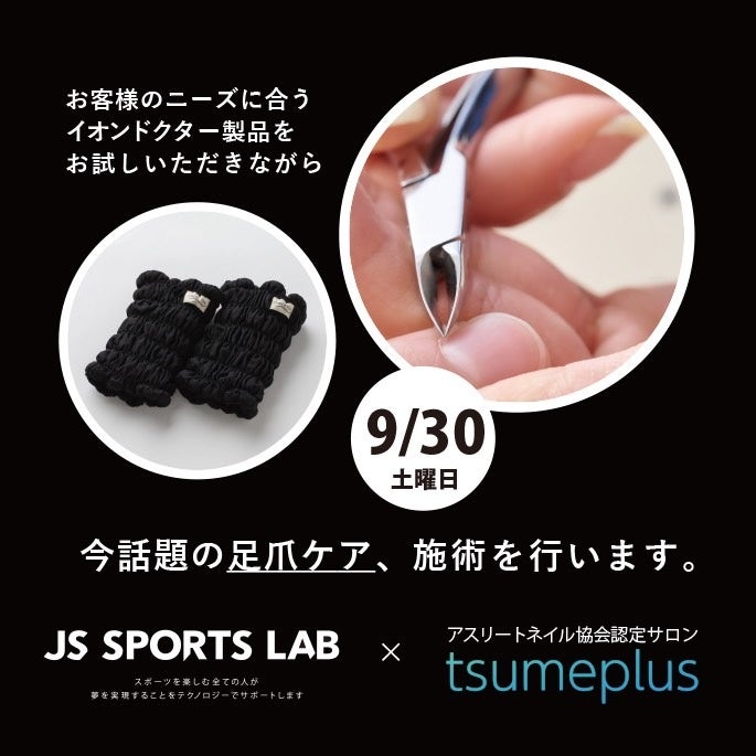 スポーツを楽しむすべての人をテクノロジーで支える「JS SPORTS LAB 駒沢」と爪専門のトレーナー「アスリートネイル協会認定サロン tsumeplus」がコラボし、足元から冷え性や巻き爪などのお悩みを解決できるイベントを、2023年9月30日(土)にJS SPORTS LAB 駒沢(東京都世田谷区)で開催します。