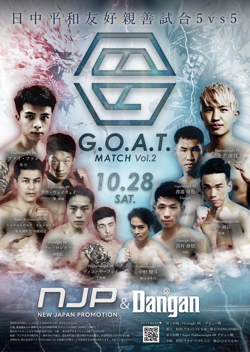 株式会社新日本プロモーション(本社 東京都中野区/代表取締役 木村英之)と株式会社DANGAN(本社 東京都墨田区/代表取締役 古澤 将太)がタッグを組み、アジアの絆をより一層深めることを目的とした特別な文化交流ボクシングイベント『G.O.A.T.MATCH』Vol.2日中平和友好親善5対5プロボクシングマッチを10月28日(土)後楽園ホールにて開催します。当日は後楽園ホールの素晴らしい舞台で、中国から来日する精鋭5選手と、日本の上位ランカー5選手が真剣勝負を繰り広げます。