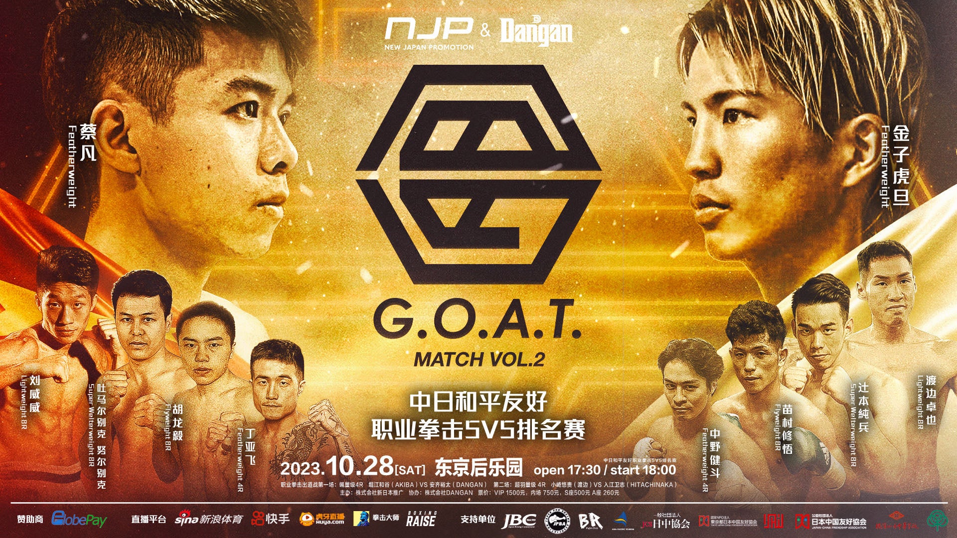株式会社新日本プロモーション(本社 東京都中野区/代表取締役 木村英之)と株式会社DANGAN(本社 東京都墨田区/代表取締役 古澤 将太)がタッグを組み、アジアの絆をより一層深めることを目的とした特別な文化交流ボクシングイベント『G.O.A.T.MATCH』Vol.2日中平和友好親善5対5プロボクシングマッチを10月28日(土)後楽園ホールにて開催します。当日は後楽園ホールの素晴らしい舞台で、中国から来日する精鋭5選手と、日本の上位ランカー5選手が真剣勝負を繰り広げます。