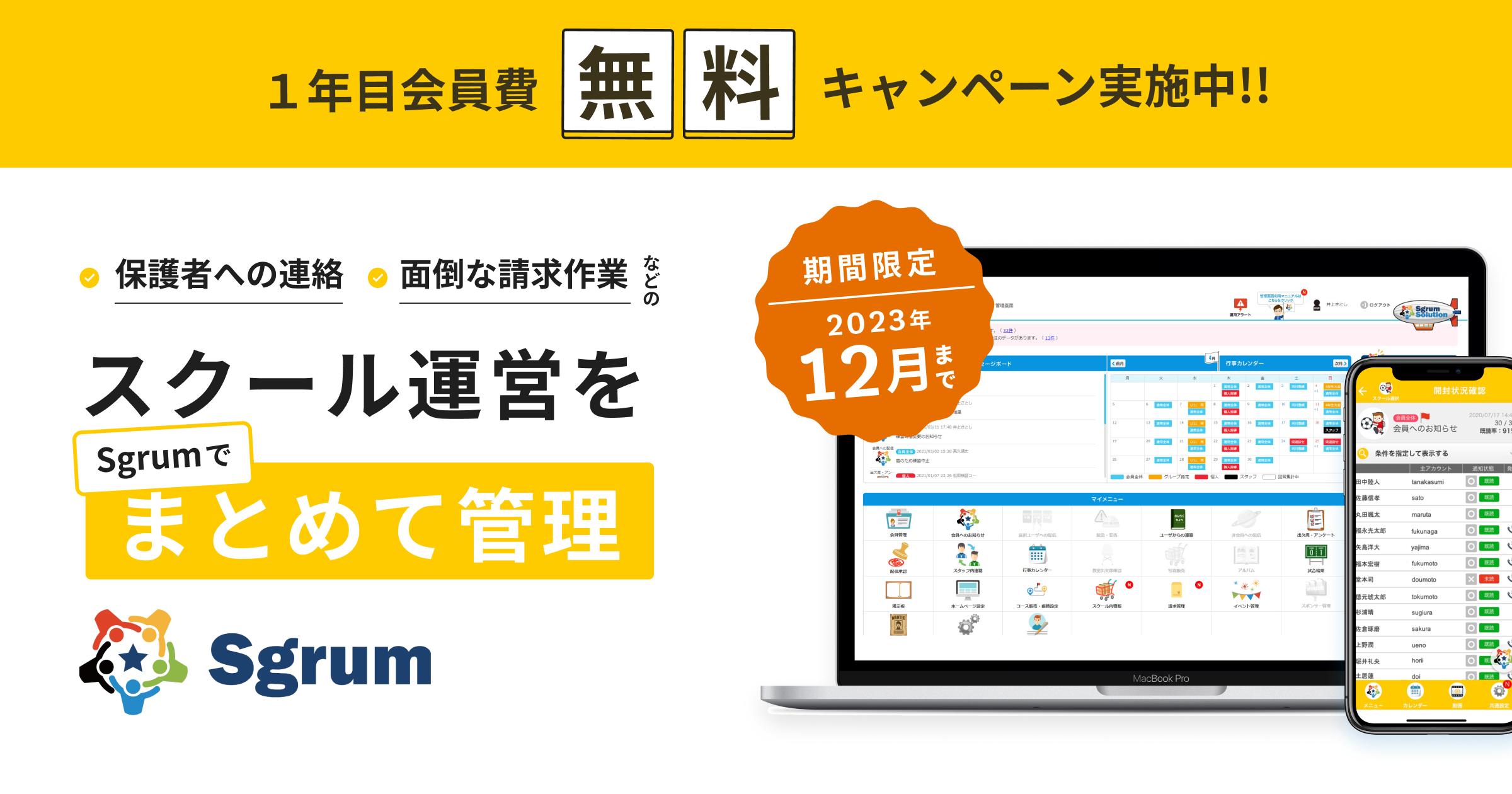 キャンペーン実施期間中にSgrumの新規ご契約をいただいた団体様(スクール/教室/クラブ/部活動など)は、会員1人あたり月額100円(税抜き)の会員費をご契約月から1年間無料とさせていただきます。
