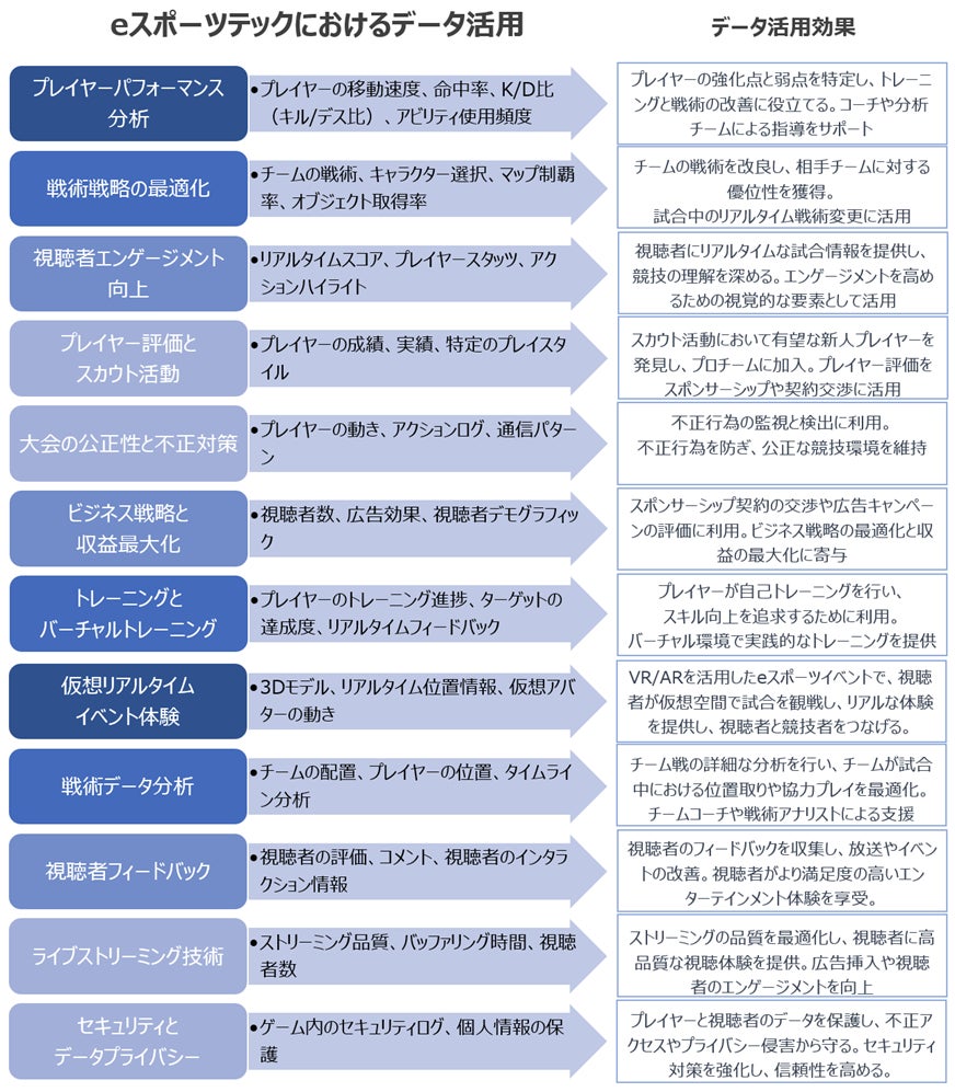 近年、テクノロジーの発展に伴い、データの収集と分析は中心的な役割を果たしています。競技者やチームのパフォーマンス向上、視聴者エンゲージメントの増加、ビジネス機会の最大化など、多くの分野でデータ活用が大きな影響を及ぼしています。以下に示した12つの分野において、データの収集とその活用方法について詳しく見てみます。以下に、eスポーツテックで使われる主要な分野、その具体的なデータ、そして活用方法を挙げます。