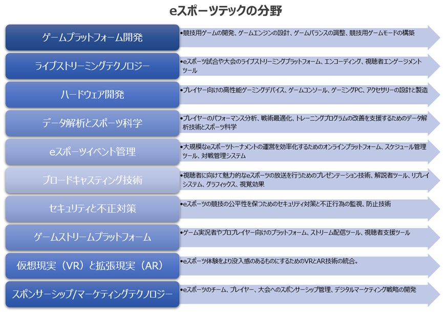 これらの分野は、eスポーツ業界の急速な成長と進化に対応し、競技者、観客、関係者の体験を向上させるために不可欠です。また、eスポーツテックは常に新しいイノベーションと技術の導入を追求しています。