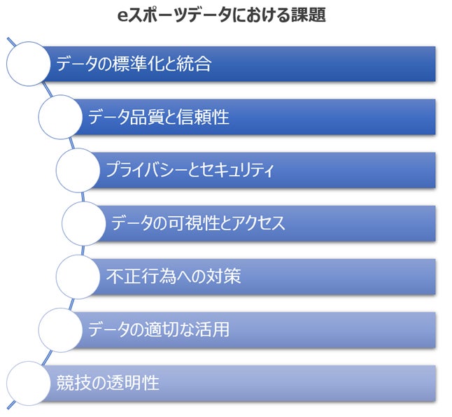 これらの課題に対処するために、業界関係者、主催者、プレイヤー、テクノロジーカンパニー、規制機関などが協力し、データの収集、保護、活用、共有に関する基準やベストプラクティスを策定しています。その成長を持続可能かつ公平なものとするために、これらの課題に取り組む姿勢が重要です。データの透明性と信頼性を高め、競技とエンターテインメントの質を向上させるために、努力が求められます。以下に、主なeスポーツテックにおけるデータの課題を挙げます。