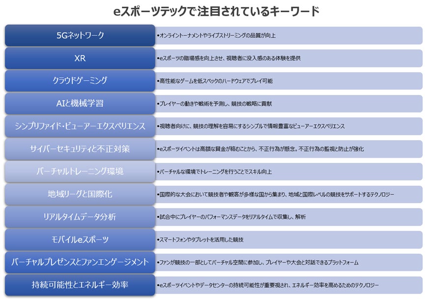 これらの要因が、日本のeスポーツテックの強みとなっており、国内外で競技者や観客に高品質なeスポーツ体験を提供しています。将来的には、日本のeスポーツ業界がさらに成長し、国際的な舞台で一層注目されることが期待されます。