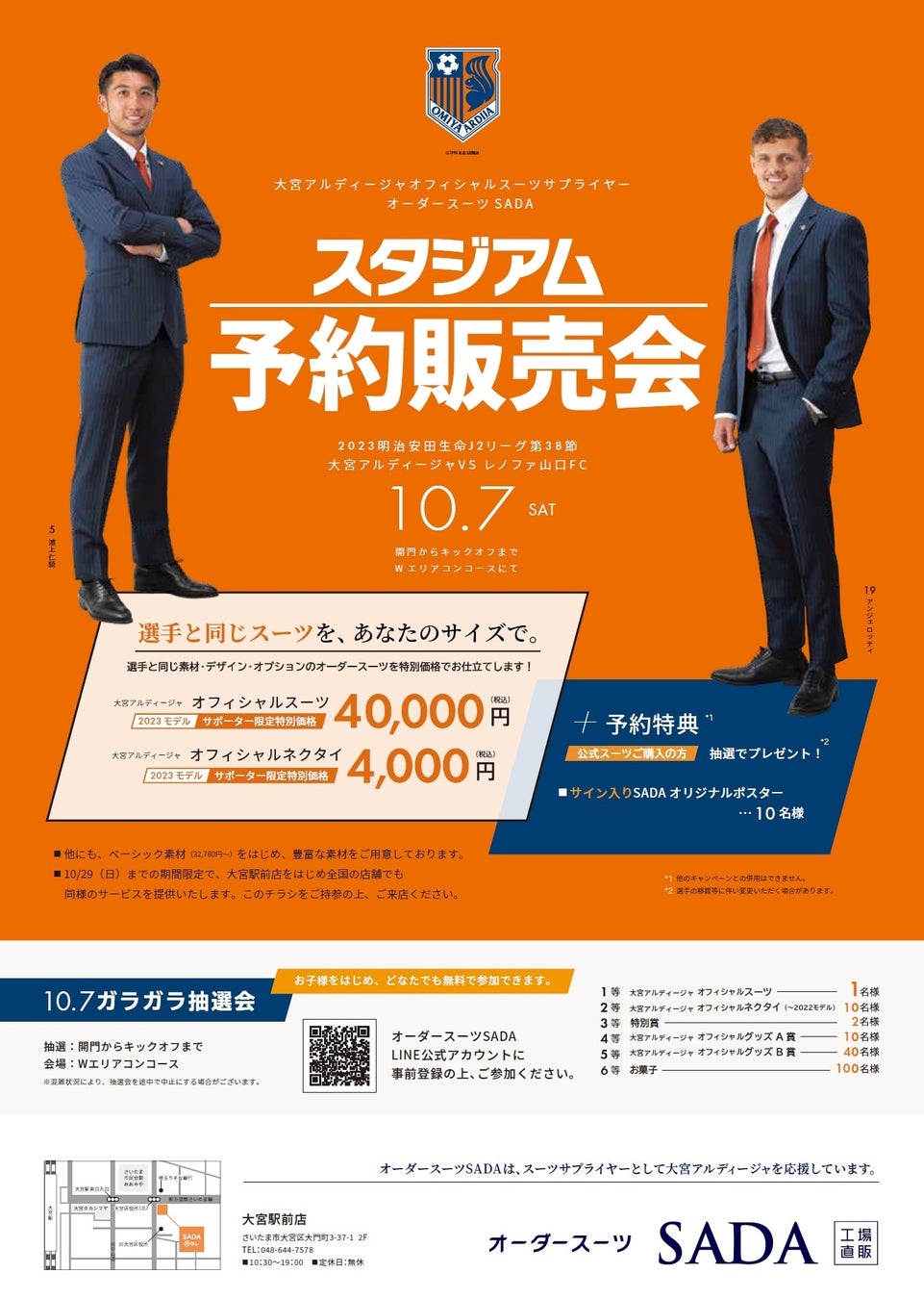 初回 19,800 円(税込 21,780 円)~オーダースーツを提供する株式会社オーダースーツ SADA(本 社:東京都千代田区、代表取締役社長:佐田展隆)は、2023 年 10 月 7 日(土)に、大宮アルディージャ オフィシャルスーツの予約販売会を開門~キックオフまで、Wエリアイベント広場にて開催いたします。オーダースーツ SADA は、オフィシャルスーツサプライヤーとして、大宮アルディージャを応援しています!