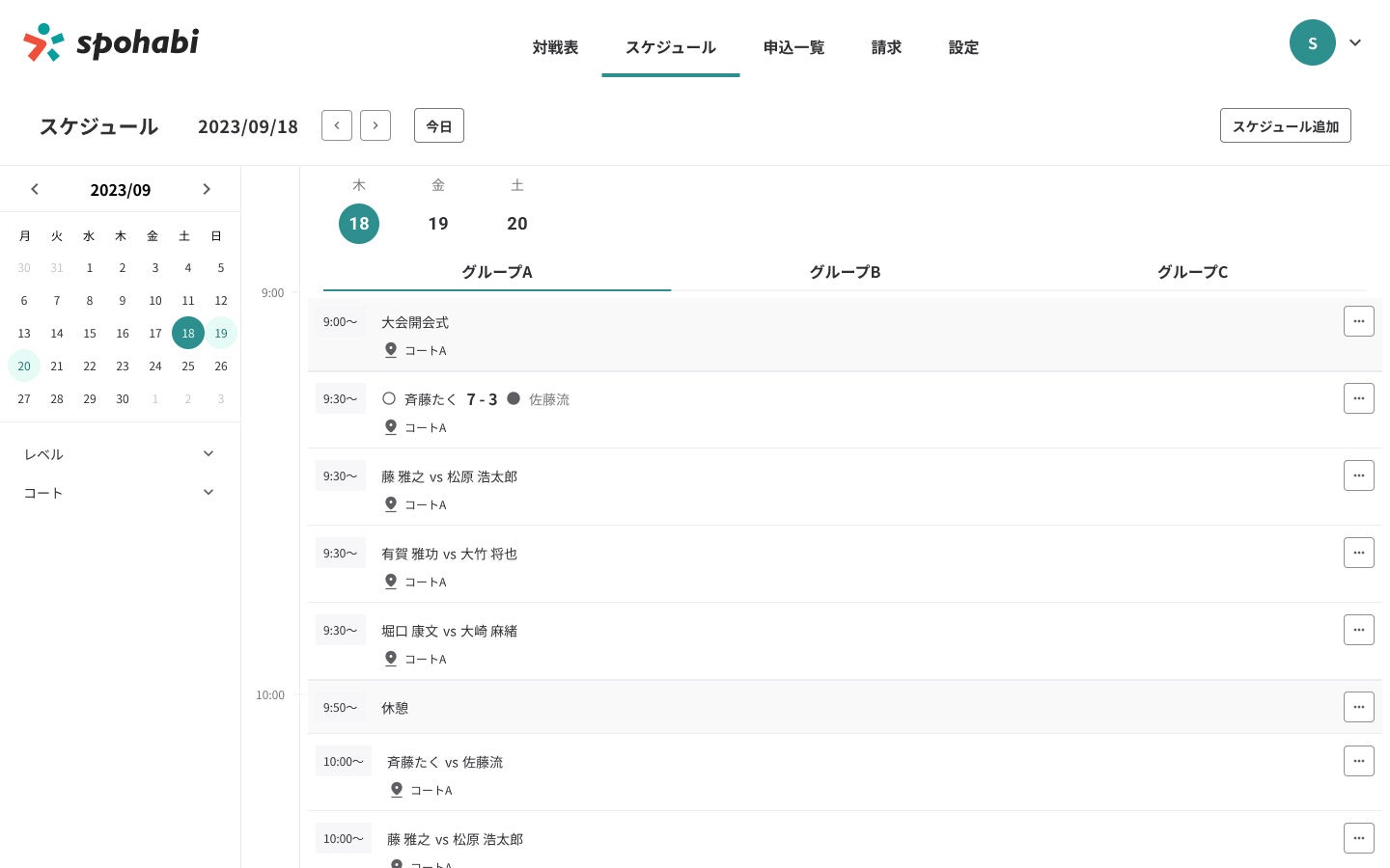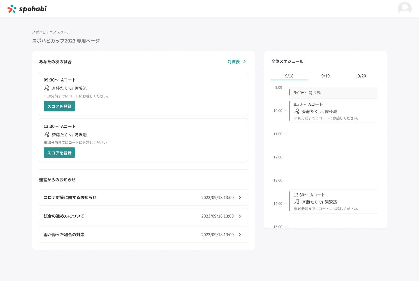 大会参加者はユーザー画面から大会スケジュールや対戦表、次の出場試合の予定をリアルタイムで確認することができます。