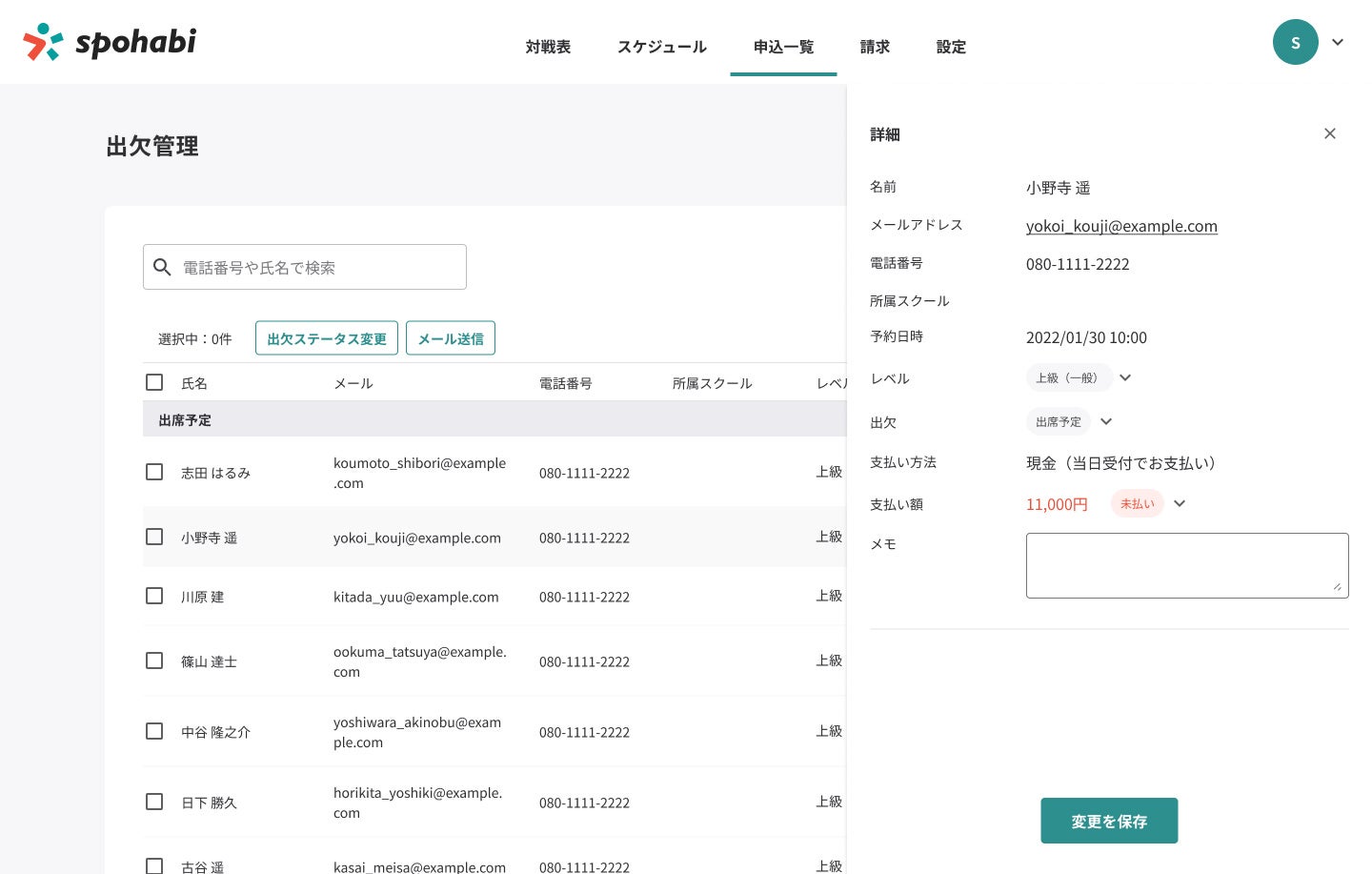 大会請求機能では参加者を一覧で表示し、支払いに関するステータス切り替えを行うことができます。