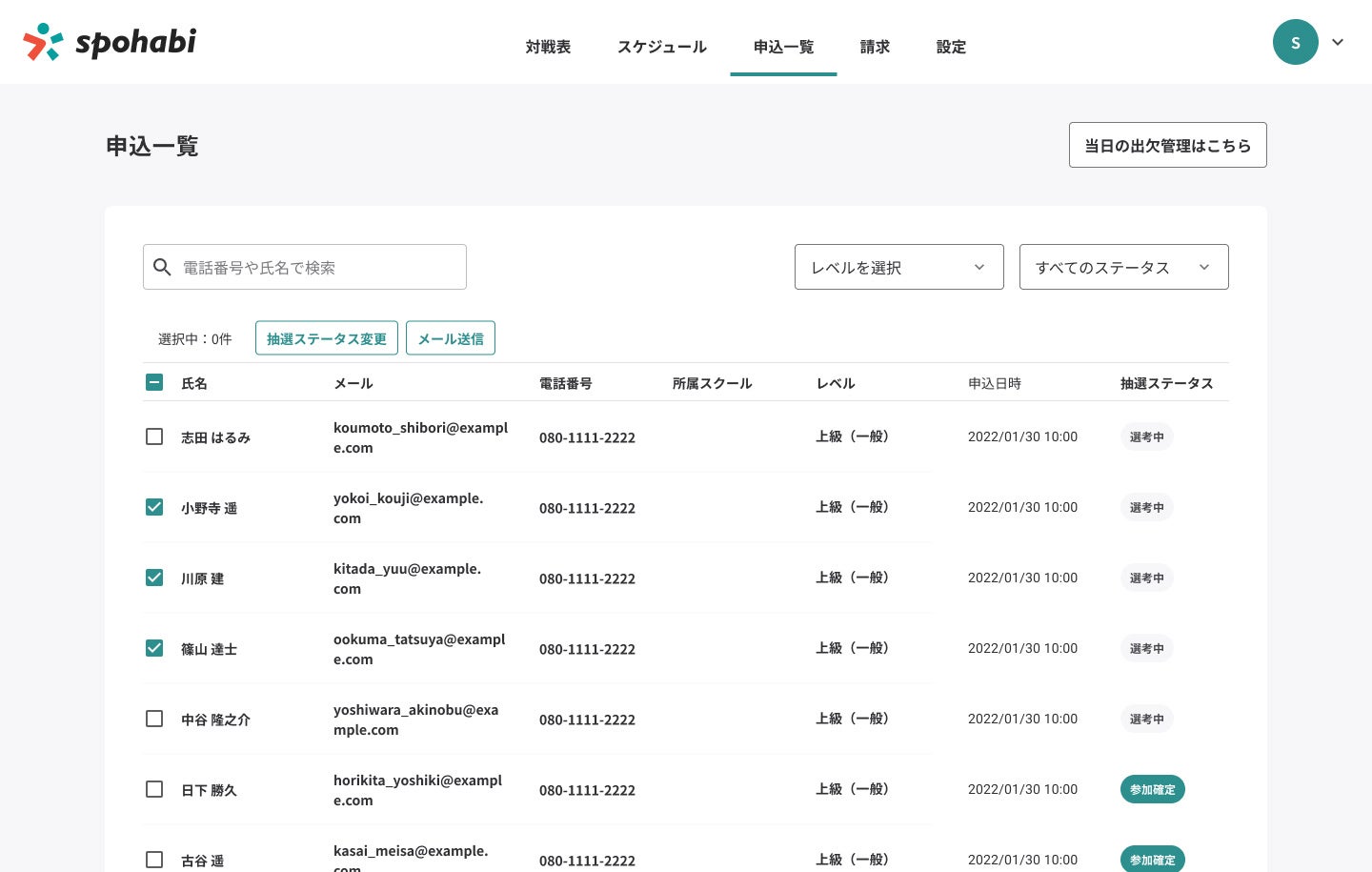 申込一覧から大会申込者および参加者の確認が可能です。ステータス管理を行えるので、選考中から参加確定への変更やメール送信を行うことができます。