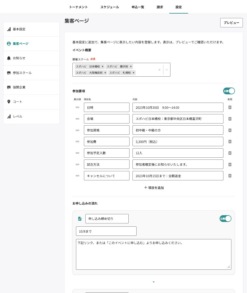 管理画面上で、大会申込みの専用ページを作成します。大会の概要などの基本設定やコートやレベルの登録、参加スクールの名前やロゴの設定などを行った後に、集客ページ設定画面にて参加要項や申込みの流れについての登録を行います。