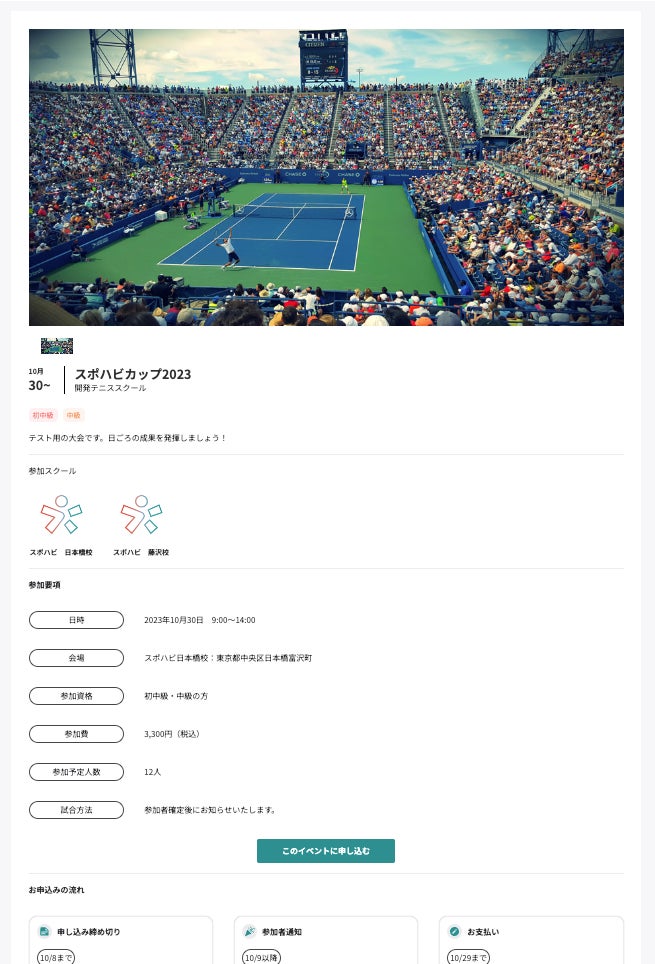 これにより、全国複数会場で行われる株式会社ルネサンス主催ジュニア向けテニス大会において、運営に関する大会申込者の対応や、トーナメント設定・出欠ならびにスコアの管理・請求管理までにスポハビ大会機能が使用されます。