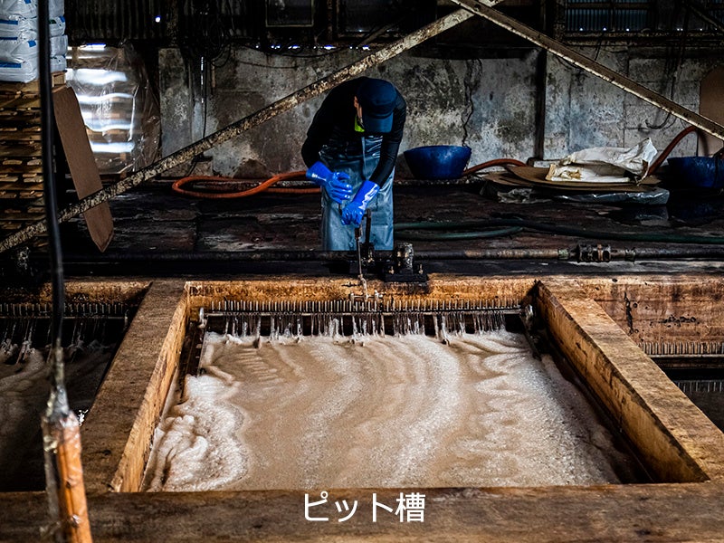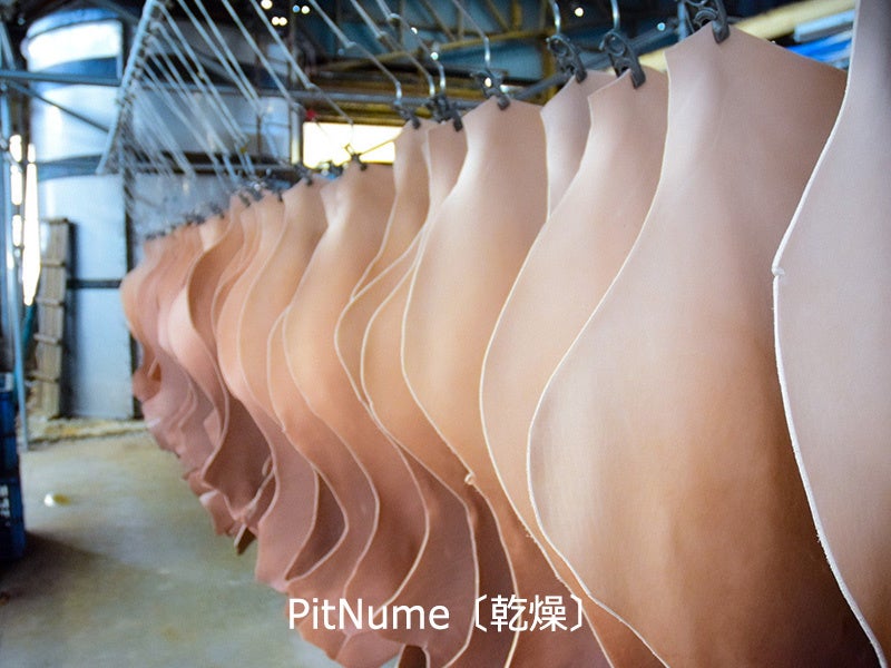 天然の植物タンニンのみで鞣されたフル植物タンニン革です。山陽では、「ピット槽」と呼ばれる植物タンニンを含んだ水溶液が入った槽に原皮を約1カ月間漬け込み鞣すという伝統的な製法で作っています。手間ひまがかかるピット槽での革づくりは、今では日本で数社、世界でも希少なものとなっています。