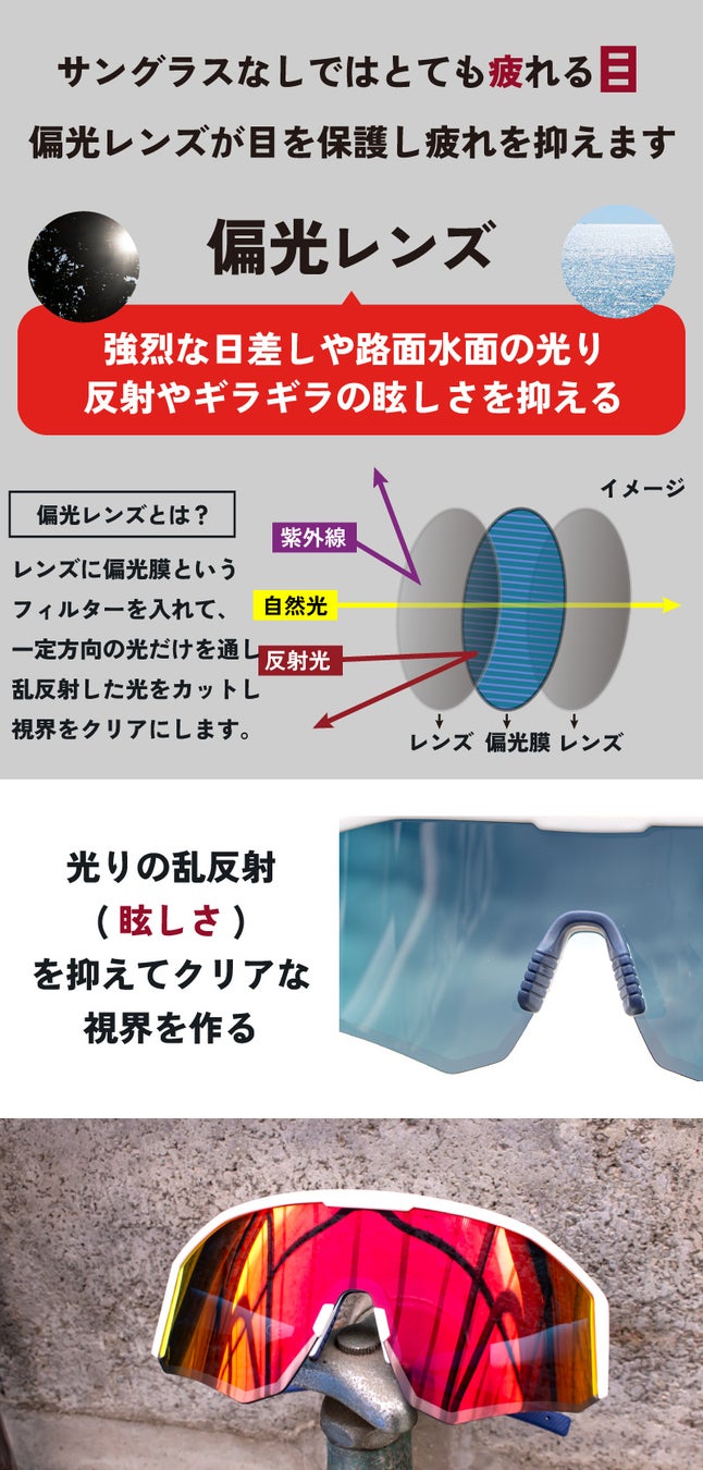 光り反射や眩しさを抑えるのが特徴の偏光レンズを採用したスポーツサングラスです。