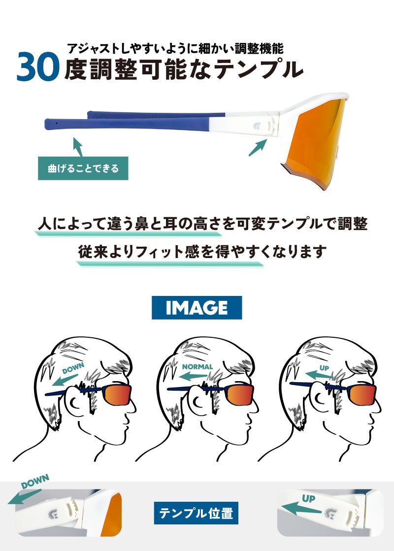 30度調整可能なテンプルは人によって違う鼻と耳の高さを可変テンプルで調整できます。