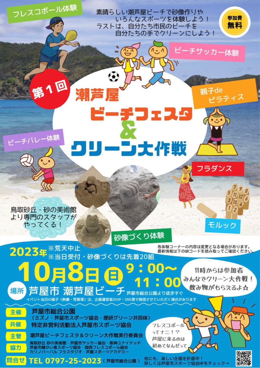 当日は、現日本代表選手の岸田直也選手(フレスコボール関西GVK)や、山下祥選手(フレスコボール明石GPA)、元日本代表の松井芳寛選手(フレスコボール関西GVK)なども来芦。関西を代表するトップ選手に直接レクチャーを受けられるまたとないチャンスとなります。ぜひ足をお運びください。フレスコボール以外にも、ビーチサッカーやモルック、親子deピラティス、フラダンス、砂像づくり体験など注目のコンテンツも多数です。