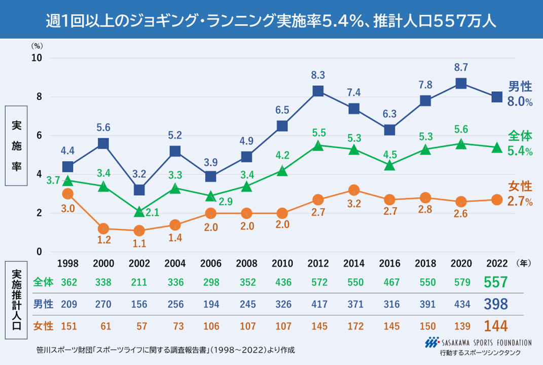 2022年の実施推計人口は、過去最高を記録した2020年の1,055万人から178万人減少し877万人であった。性別にみると男性は612万人、女性は245万人であり年1回以上ジョギング・ランニングを実施する人は男性に多い。この傾向は調査を開始した1998年から同様であり、2002年から2012年にかけて広がった実施率の男女差は開いたままである。