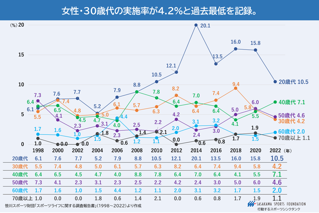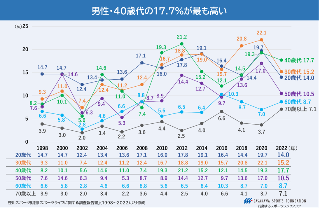 ※笹川スポーツ財団「スポーツライフに関する調査報告書」(1998~2022)より作成