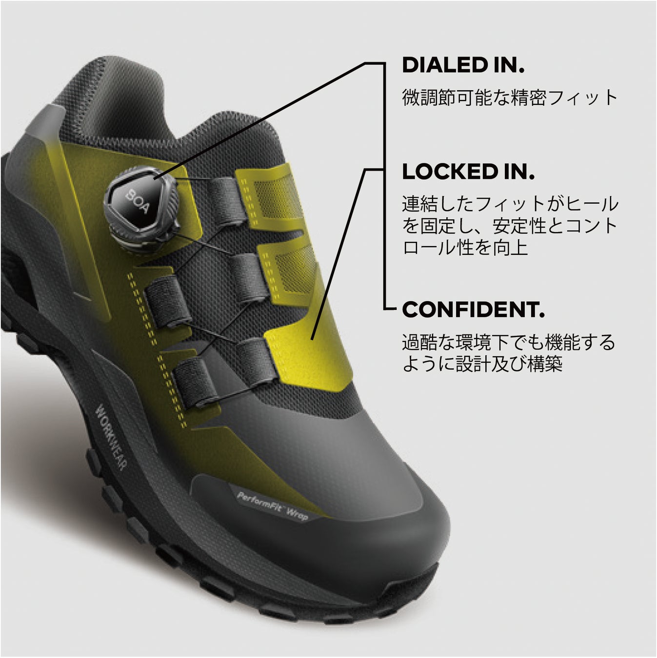 「私たちは、BOA® が最も過酷な気象条件や作業環境において、優れた安定性、効率性、耐久性を実現し、それにより疲労を軽減し、現場での作業者の能力を向上させることに重点を置いています。ミッドソール、前足部の自由度の向上を実現します。」