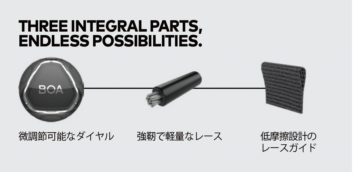 BOA Technology Inc. は、各業界のリーディングブランドと提携し、特許取得済みの BOA®フィットシステムを通じて最高のギアを開発、強化しています。パフォーマンスのための専用フィットソリューションを提供する BOA®フィットシステムは、スノースポーツ、サイクリング、ハイキング/トレッキング、ゴルフ、ランニング、コートスポーツ、ワークウェア、医療用ブレースなどの幅広い製品に採用されています。このシステムは、微調節可能なダイヤル、軽量で耐久性のあるレース、低摩擦のレースガイドで構成されています。それぞれの独自の構成は、微調節可能な精密フィットを提供するように設計されており、BOAライフタイム保証制度によってサポートされます。