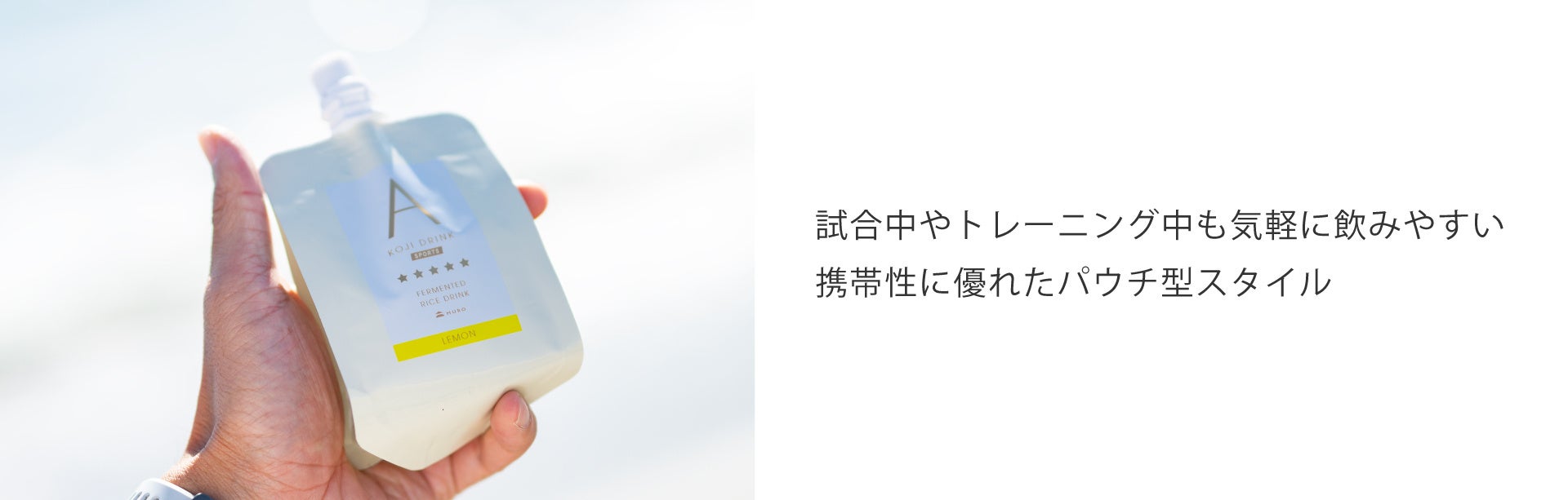 そこでお客様からの声に応え、レジスタントプロテインも多く含む「KOJI DRINK A」をベースに自然由来のレモン果汁を加えた、スパウトタイプの新商品「KOJI DRINK A SPORTS」を開発しました。甘さを抑え、さらにすっきりとした味わいで疲労回復に役立ち、また持ち運びやすさと廃棄の簡便さも特徴です。ハードなスポーツ選手から、アクティブに行動する人、回復の必要なタイミングに、「KOJI DRINK A SPORTS」がより健やかな毎日をサポートします。商品の詳細や取り扱い店舗については、当社公式ウェブサイトにてご確認いただけます。