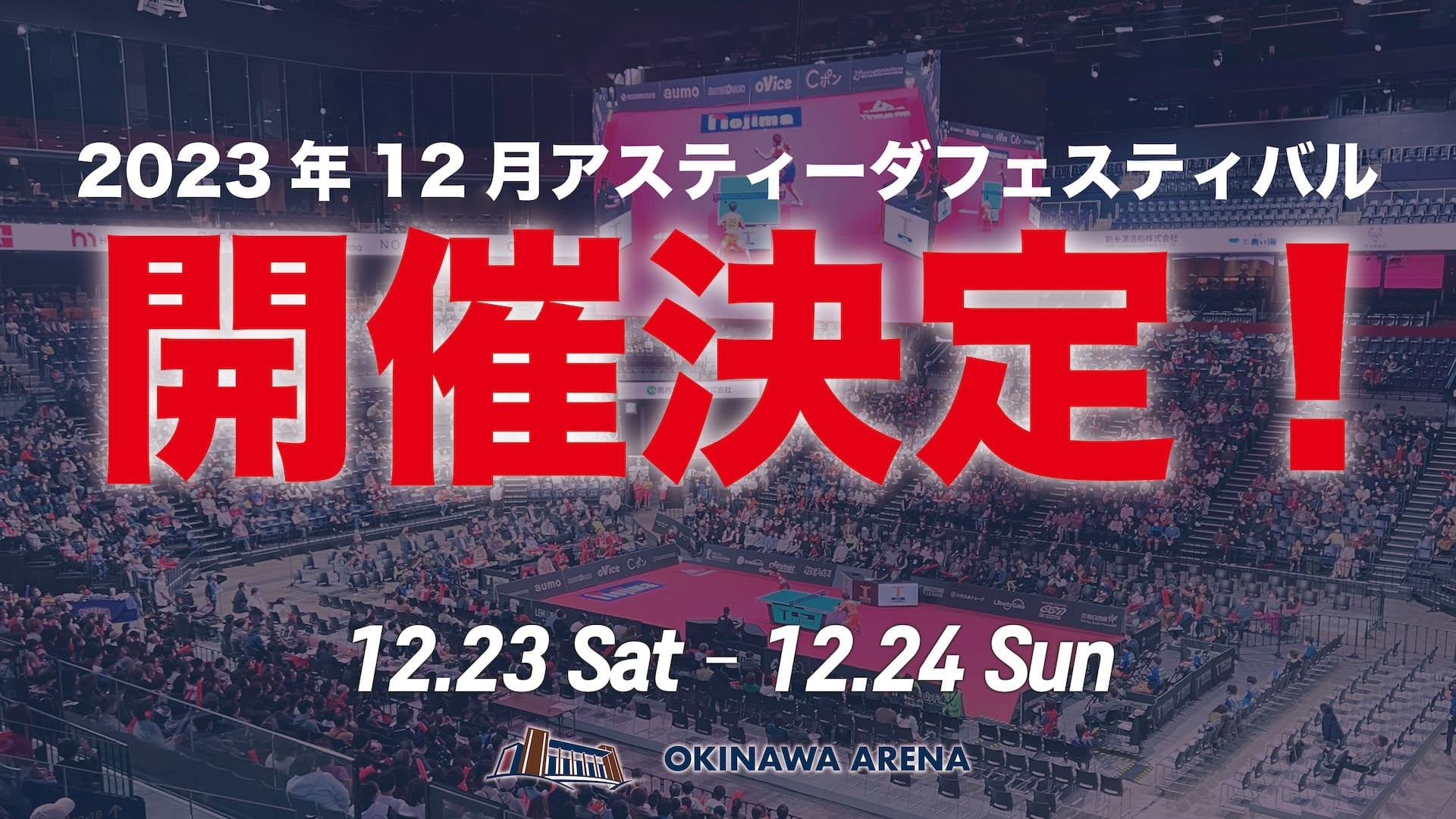 「世界を獲りいくよ。」をスローガンに沖縄県を拠点に活動する卓球Tリーグチームの琉球アスティーダ(運営会社:琉球アスティーダスポーツクラブ株式会社、所在地:沖縄県中頭郡中城村、代表取締役:早川周作)は、2023年12月23日、24日沖縄アリーナで琉球アスティーダの祭典「アスティーダフェスティバル2023」を開催します。 “スポーツ!音楽!食!最高のエンターテインメントを!”のテーマのもと、開催されるイベントは、昨年度も開催され、2日間で2万人超が来場しました。withコロナ時代のコロナ復興イベントとして、「肉王フェス」や「沖縄再発見!物産展」、「アスティーダエンターテインメントフェス」、「スポーツイノベーション オキナワ」、「SPORTS体験」などが展開され大きな賑わいを見せました。沖縄の新たなコンテンツとして期待が膨らんでいるイベントとなっています。