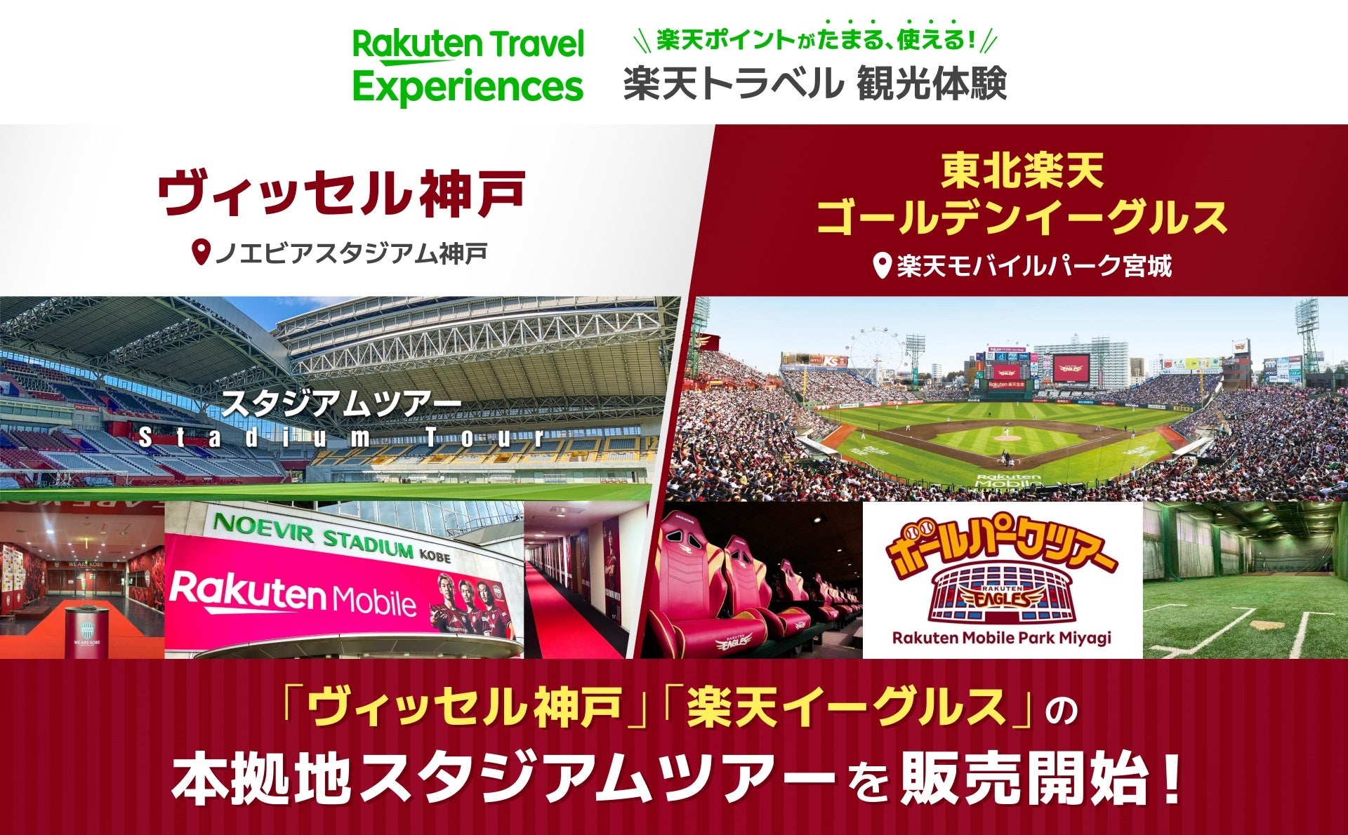 サッカーやラグビーの国際試合から企業イベントまで、幅広い目的に利用されている「ノエビアスタジアム神戸」は、観客席とグラウンドの距離が近く、臨場感溢れる試合を楽しむことができる全天候型のスタジアムです。一方、「楽天モバイルパーク宮城」は、野球観戦だけでなく、観覧車をはじめとするアトラクションや宿泊施設など、多様な楽しみ方を備えたボールパークであるとともに、日本一のサステナブル・スタジアムを目指しています。各スタジアムのツアーは、普段入ることができないエリアや選手が使用している設備を間近に見ることができ、両チームのファンに限らず、幅広いスポーツファンが楽しめる内容となっています。