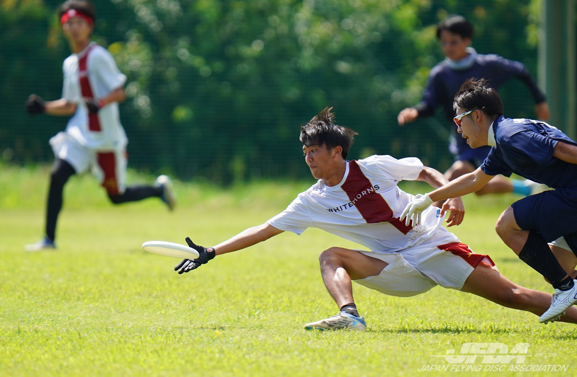 アルティメット(Ultimate)は、各7人からなる2チームが100m×37mのコートでディスクをパスしながら運び、エンドゾーン内でパスをキャッチすると得点(1点)となります。球技にはないディスクの飛行特性を利用すること、スピードや持久力を必要とすること、スピリット・オブ・ザ・ゲーム(Spirit of the game)という基本理念に基づいた自己審判制(セルフジャッジ)を採用していることから究極(Ultimate)という名前がつけられました。ユース世代各部門は5人制にて競技を行います。
