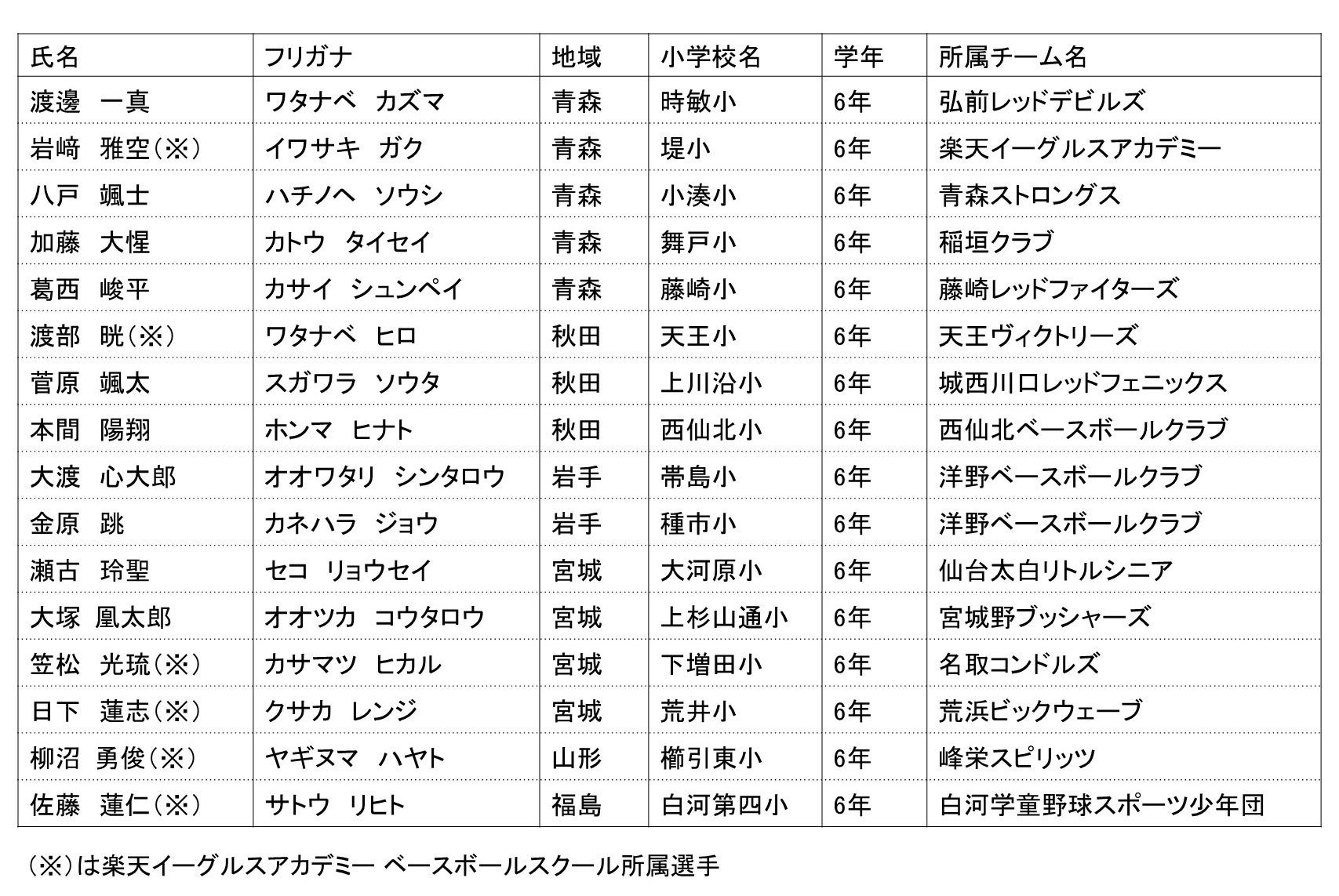 通称「楽天ジュニア」は「NPB12球団ジュニアトーナメント」に出場し、東北野球の実力を全国に示すために結成するチームです。東北6県と東北隣県の少年野球選手の中から選出される16名は、技術はもちろんのこと、野球に取り組む姿勢・元気・礼儀・チームワーク、そして私生活も含め、東北の少年野球選手たちの目標となりうる存在でなければなりません。各選手は、一般公募セレクション・最終セレクションでの審査を経て、選出されました。
