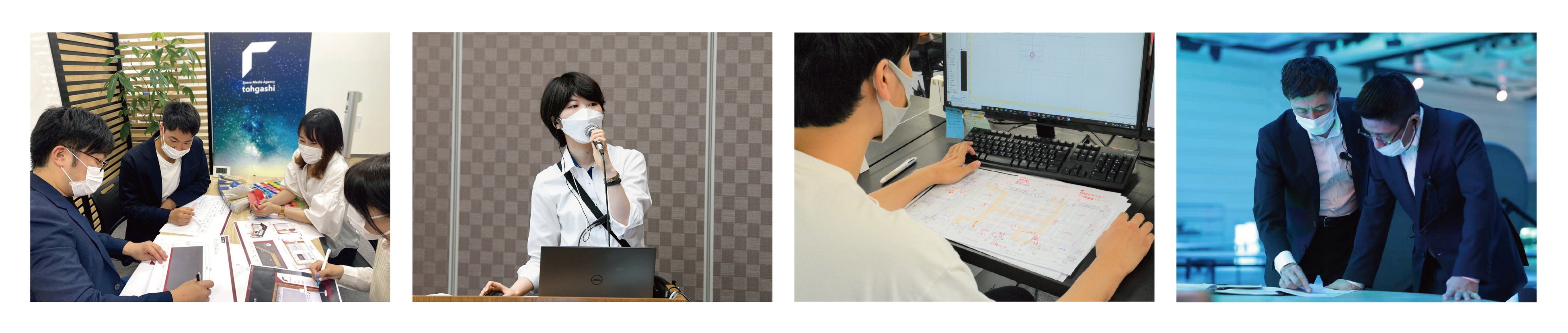 (左)会社での業務の様子 /(右)トーガシがスポンサーを務めたラジオ登壇の様子